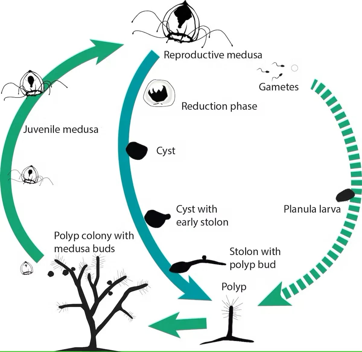 Z Turritopsis dohrnii jest nieco inaczej. Do pewnego punktu podąża tym cyklem, ale nie zawsze umiera. Ciekawym stadium jest tzw. cysto, które ma postać galaretowatej kuli, która dryfuje w oceanie, aż przyczepi się do dna morskiego i stworzy polip, który da początek nowym meduzom. Proces ten może zachodzić bez końca, a jeden osobnik jest praktycznie nieśmiertelny.