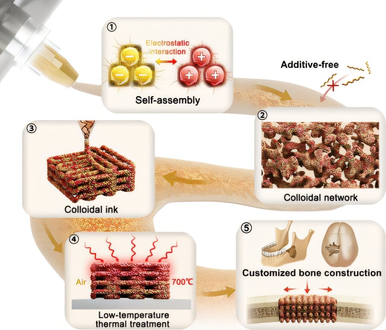 Naukowcy połączyli przeciwnie naładowane cząsteczki krzemionki z jonami wapnia i fosforanu, tworząc specjalny żel nadający się do druku 3D. Materiał utwardza się w temperaturze około 700oC, co stanowi znaczące obniżenie w porównaniu z tradycyjnymi procesami.