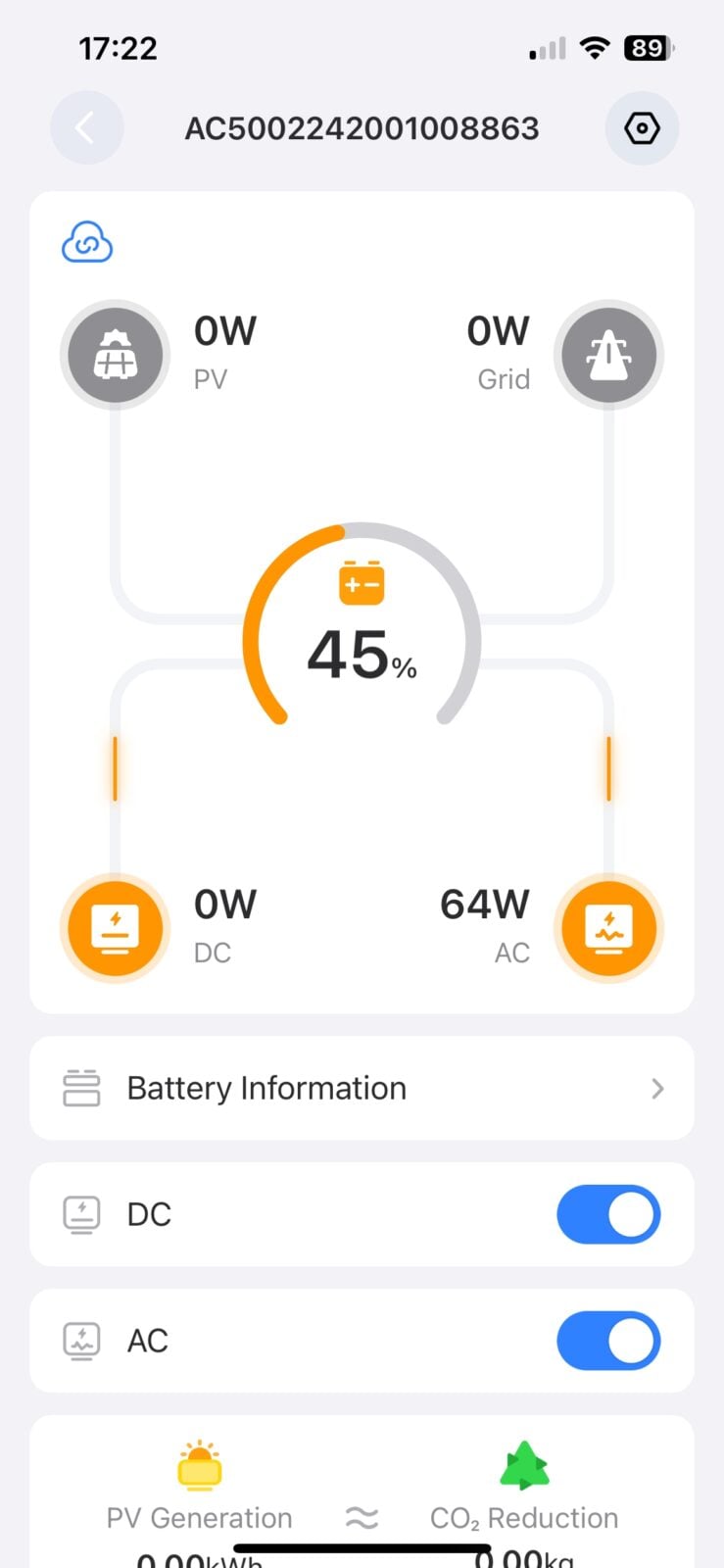 Po spięciu ze sobą obu modułów pora włączyć całą maszynerię (wystarczy jeden z przycisków, bo moduły komunikują się ze sobą) i rzucić okiem na wybudzony wyświetlacz, który na szczęście jest również dotykowy. Widać na nim oczywiście poziom naładowania baterii, jak również potencjalną konsumpcję energii z podłączonych do systemu urządzeń (AC Load i DC Load wyrażoną w watach), podobnie jak ilość energii pobieranej z różnych źródeł (PV – fotowoltaika, Grid – sieć elektryczna). W razie kłopotów jednym dotknięciem na ekranie możemy wyłączyć wszystkie złącza dla prądu zmiennego (AC Off) oraz stałego (DC Off).