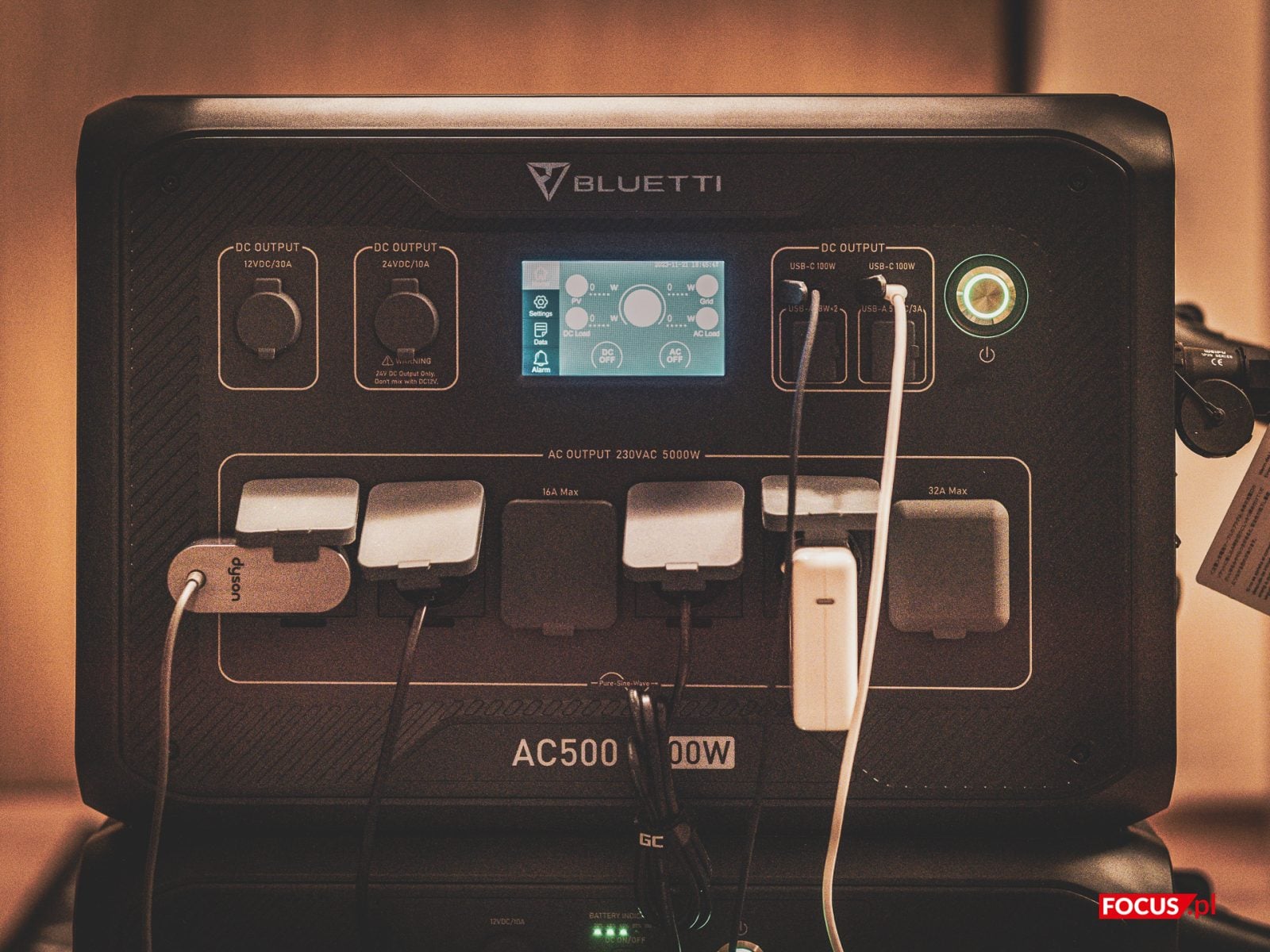 Pod względem możliwości pozyskiwania energii, combo Bluetti AC500 i Bluetti B300S oferują aż sześć sposobów: standardowa sieć elektryczna (5000W), fotowoltaika (3000W), generator (5000W), zapalniczka samochodowa, akumulator kwasowo-ołowiowy (12V/24V) i tzw. multi charge (sieć elektryczna + baterie słoneczne i tu aż 8000W). Rzućmy jeszcze krótko okiem na front AC500, bo tam dzieje się bardzo dużo. Pod gumowymi dużymi zaślepkami kryje się pięć gniazd 230V/16A oraz szóste 3-pinowe złącze 230V/32A przeznaczone do sprzężenia z domową instalacją elektryczną (w końcu system może działać też jako domowy UPS). Do tego mamy jeszcze dwa porty USB-C (do 100W) i aż cztery porty USB-A (2 x 5V/3A i 2 x 18W). Zestaw zamykają gniazda zasilania 12V/30A (dla pojazdów typu kamper) oraz standardowe gniazdo zapalniczki.