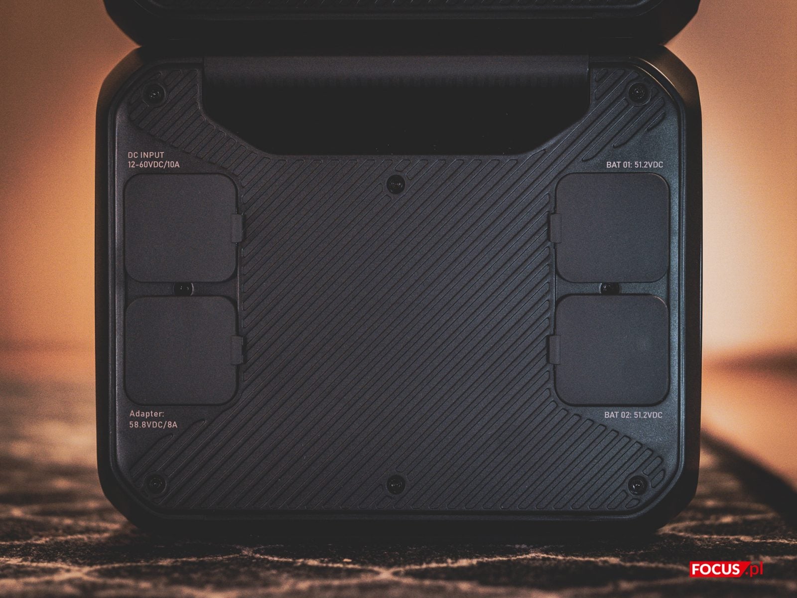 Poszczególne moduły spinamy ze sobą solidnym grubym kablem, który przychodzi w zestawie z każdą baterią B300S. Wymaga on zabezpieczenia obu końcówek specjalnym zatrzaskiem (dopiero wtedy rozpocznie się faktyczny przesył energii). Gniazd oznaczonych jako BAT 01 i BAT 02 na szczęście nie sposób pomylić z innymi portami na boku, których akurat w przypadku AC500 jest dość sporo. Bliżej przedniej krawędzi znajdziemy port do ładowania całej konstrukcji z gniazdka elektrycznego (AC Input). Poniżej znajduje się też port umożliwiający podłączenie stacji zasilania bezpośrednio do paneli fotowoltaicznych (stosowny kabel ze złączem MC4 znajdziemy w zestawie z AC500, podobnie jak standardowy kabel zasilający oraz drugi kabel z końcówką MC4, tym razem przeznaczony do gniazda zapalniczki samochodowej).