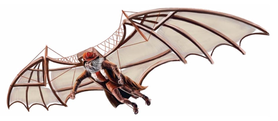 Zainspirowany ptakami Leonardo da Vinci zaprojektował szereg maszyn latających, nieco przypominających współczesne lotnie. Był również autorem szkiców ornitoptera, maszyny latającej z ruchomymi skrzydłami, napędzanej siłą ludzkich mięśni. Podobnie jak helikopter Leonarda żadna z tych trzepoczących aerodyn nie mogła wyjść poza fazę projektu – wyjątkiem jest tu skonstruowana przez niego lotnia. Lot napędzany trzepoczącymi skrzydłami wymaga więcej energii niż są w stanie wygenerować ludzkie mięśnie. Lot wzbudzany ich siłą musiał poczekać do końca XX wieku i rozwoju ultralekkich materiałów konstrukcyjnych, które są w stanie zrekompensować względną słabość naszych mięśni. Kiedy w końcu doszło do lotu napędzanego ich siłą, maszyny nie machały skrzydłami i ledwo udawało się utrzymać je w powietrzu.