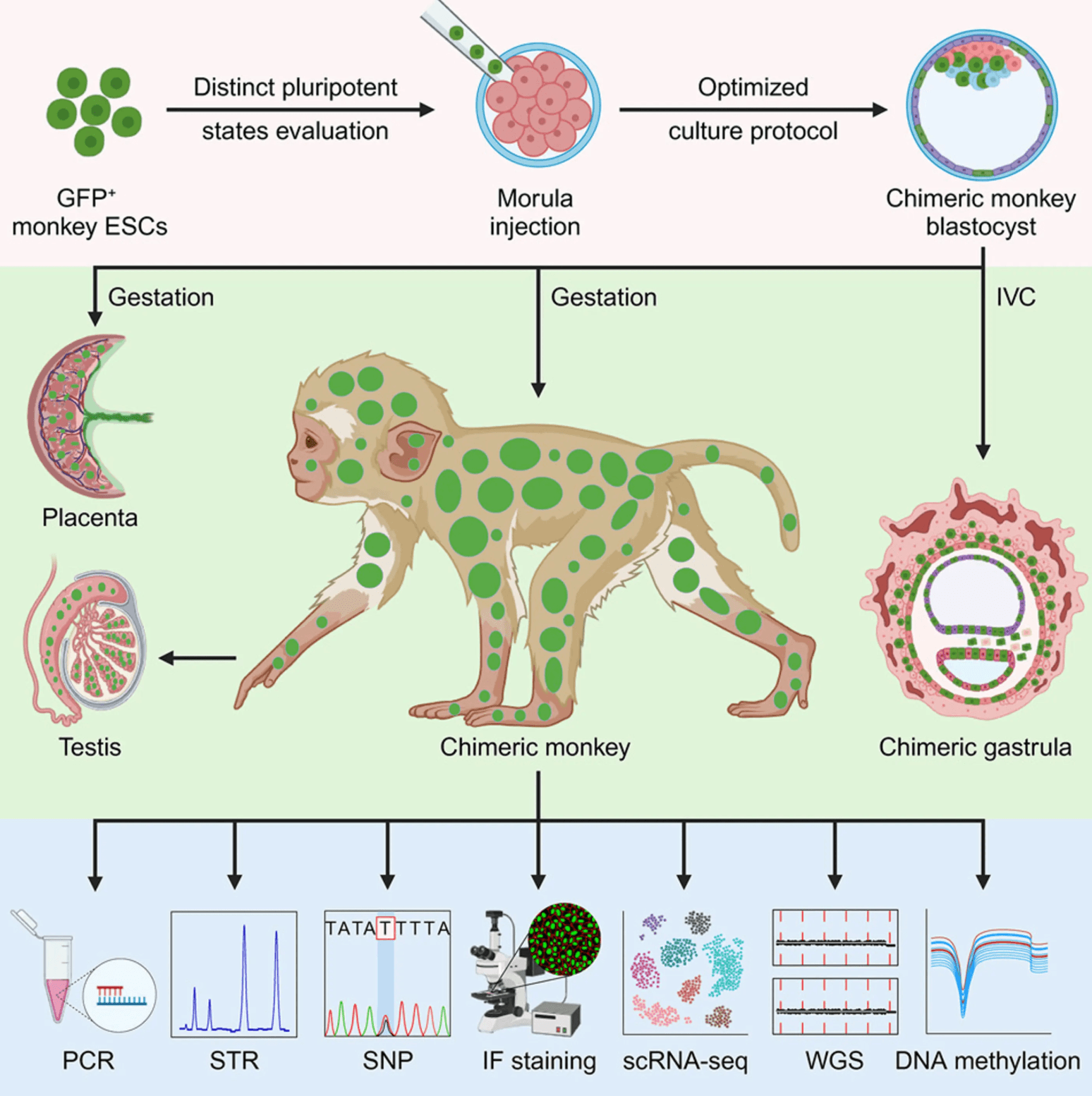 Do barwienia tych pluripotencjalnych komórek macierzystych, które wprowadzono do embrionu, wykorzystano białko zielonej fluorescencji, aby monitorować, do rozwoju której części małpy najbardziej się zaangażowały. Wyniki przeszły najśmielsze oczekiwania. Po urodzeniu, młody makak miał plamy dosłownie na całym ciele, w tym opuszkach palców i oczach. Sekwencjonowanie genów wykazało, że komórki macierzyste dawcy były obecne w 26 różnych typach tkanek, stanowiąc od 21 do 92 proc. tej tkanki – najwięcej w mózgu.