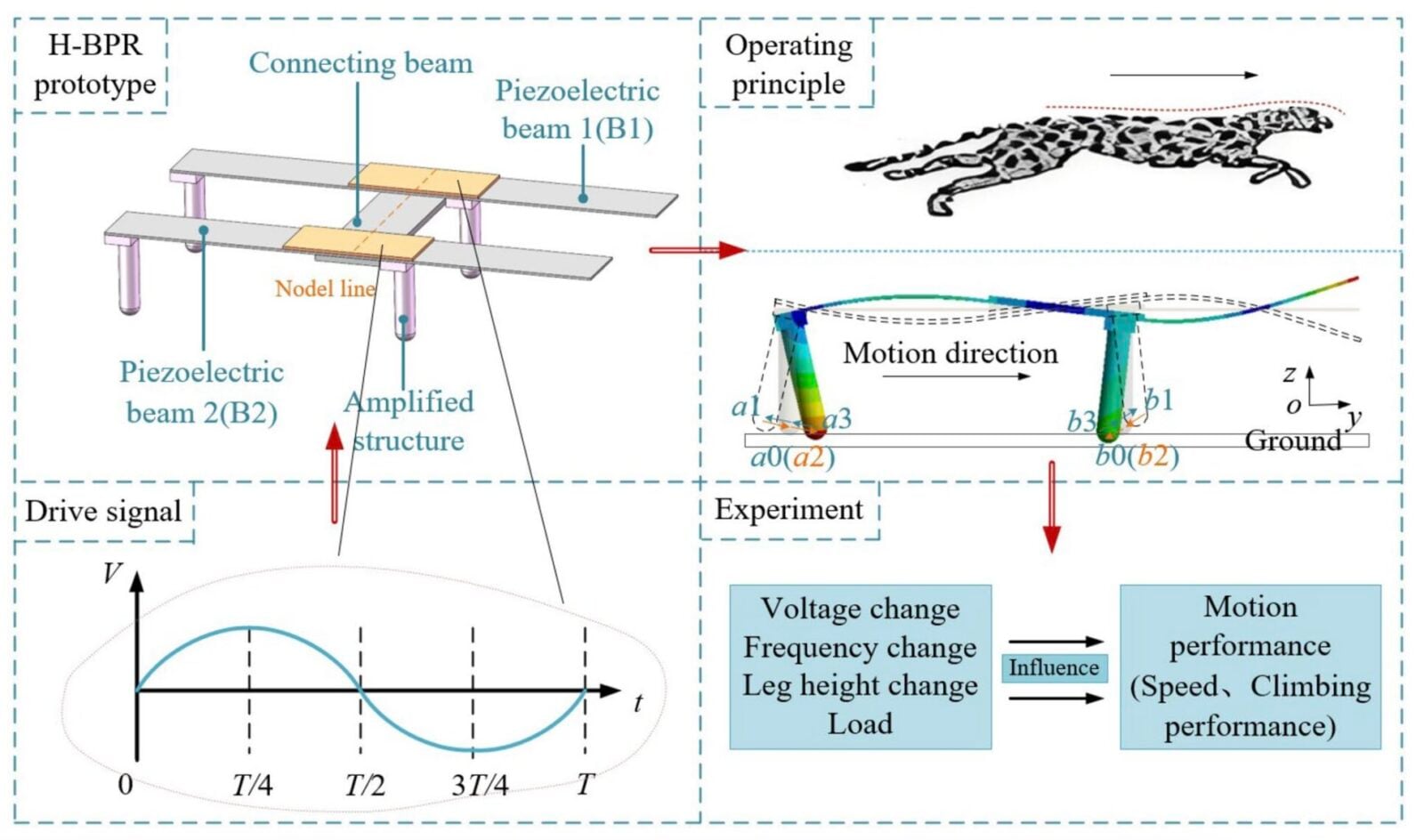 Robot, nazwany H-BPR (H-Shaped Bionic Piezoelectric Robot), waży zaledwie 38 gramów i mierzy 150 x 80 x 31 mm. Jego konstrukcja opiera się na czterech nogach połączonych trzema belkami piezoelektrycznymi, które wykorzystują zginające się wibracje do naśladowania okresowych ruchów nóg geparda. Dzięki temu robot może wykonywać zarówno ruchy liniowe, jak i obroty o różnym promieniu, co jest możliwe dzięki zastosowaniu różnicy napięcia jako metody napędowej.