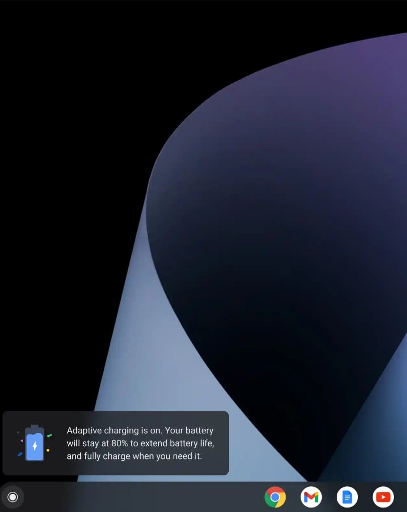 Kolejną nowością, jaką wprowadza aktualizacja, jest ładowanie adaptacyjne, mające rzekomo poprawić żywotność akumulatora. Opcję można włączyć w Ustawienia > Urządzenie > Zasilanie > Ładowanie adaptacyjne. Według producenta, po włączeniu funkcji Chromebook naładuje się do 80%, a następnie użyje uczenia maszynowego, aby dowiedzieć się, jakie masz nawyki odłączania i naładować go do 100% powoli.