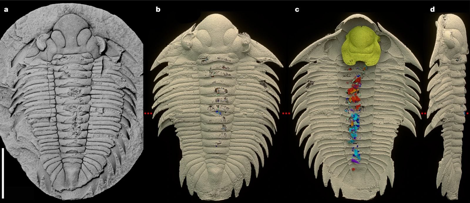 Okazało się, że była jedna z pierwszych skamieniałości przebadana tą metodą w Grenoble. Wyniki analizy były sensacyjne – opublikowano je w Nature. W pewnym sensie możemy się już domyślać, że wewnątrz organizmu odnajdziemy treść żołądkową, która nie została jeszcze strawiona przez trylobita i miała potencjał fosylizacyjny (np. były to różne skorupki i pancerzyki mniejszych zwierząt).