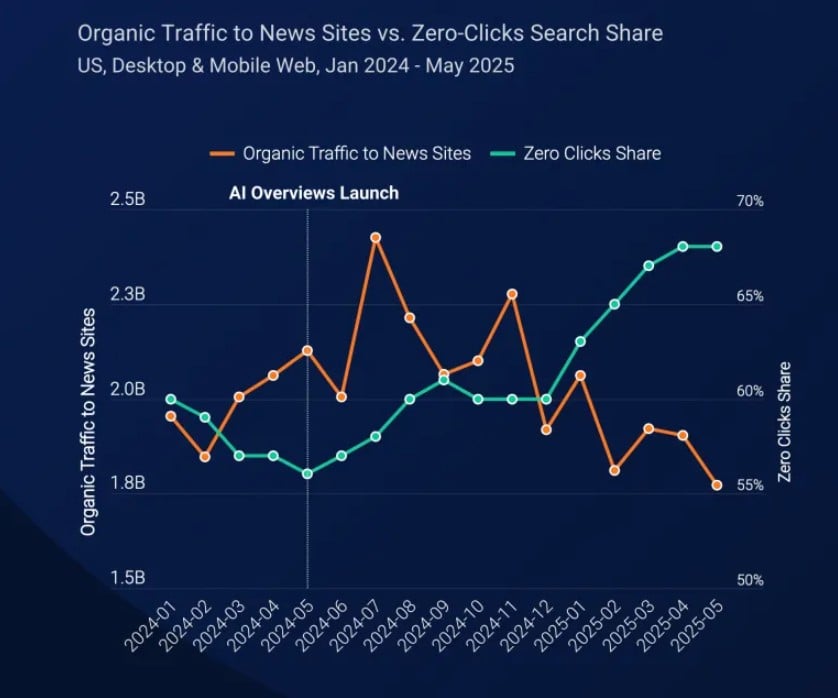 Techniczny argument koncernu brzmi przekonująco: funkcje AI Overviews zawierają więcej linków niż tradycyjne wyniki. Teoretycznie powinno to oznaczać więcej możliwości dla właścicieli witryn. Ale teoria nie zawsze idzie w parze z praktyką. To właśnie pokazują niezależne analizy, malując znacznie mniej optymistyczny obraz sytuacji. Wyniki badania Similarweb pokazują drastyczny wzrost wyszukiwań, które nie kończą się przejściem na żadną stronę – z 56% w maju 2024 do 69% rok później w kategorii wiadomości. To szczególnie bolesne dla wydawców mediów, którzy od lat borykają się z kurczącymi się przychodami z reklam.