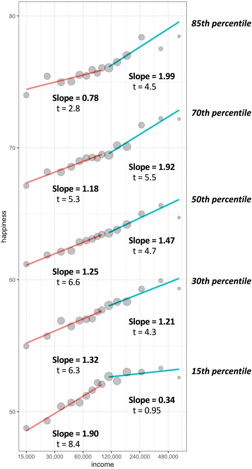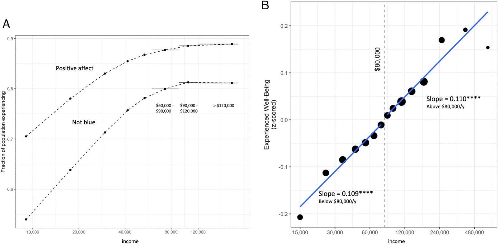 Uszczegóławiając, wzrost szczęścia notuje się u wszystkich badanych ludzi, jeśli ich dochody rosną do około 100 tys. dolarów rocznie (ok. 430 tys. złotych, czyli niecałe 36 tys. miesięcznie). Potem następuje rozwarstwienie w zebranych danych. Niewielka grupa ankietowanych nie wykazywała żadnego wzrostu poczucia dobrobytu emocjonalnego bez względu na fortunę, którą dysponowała, ale większość z tej bogatszej grupy wraz ze wzrostem dochodów odczuwała logarytmicznie rosnące uczucie szczęścia.