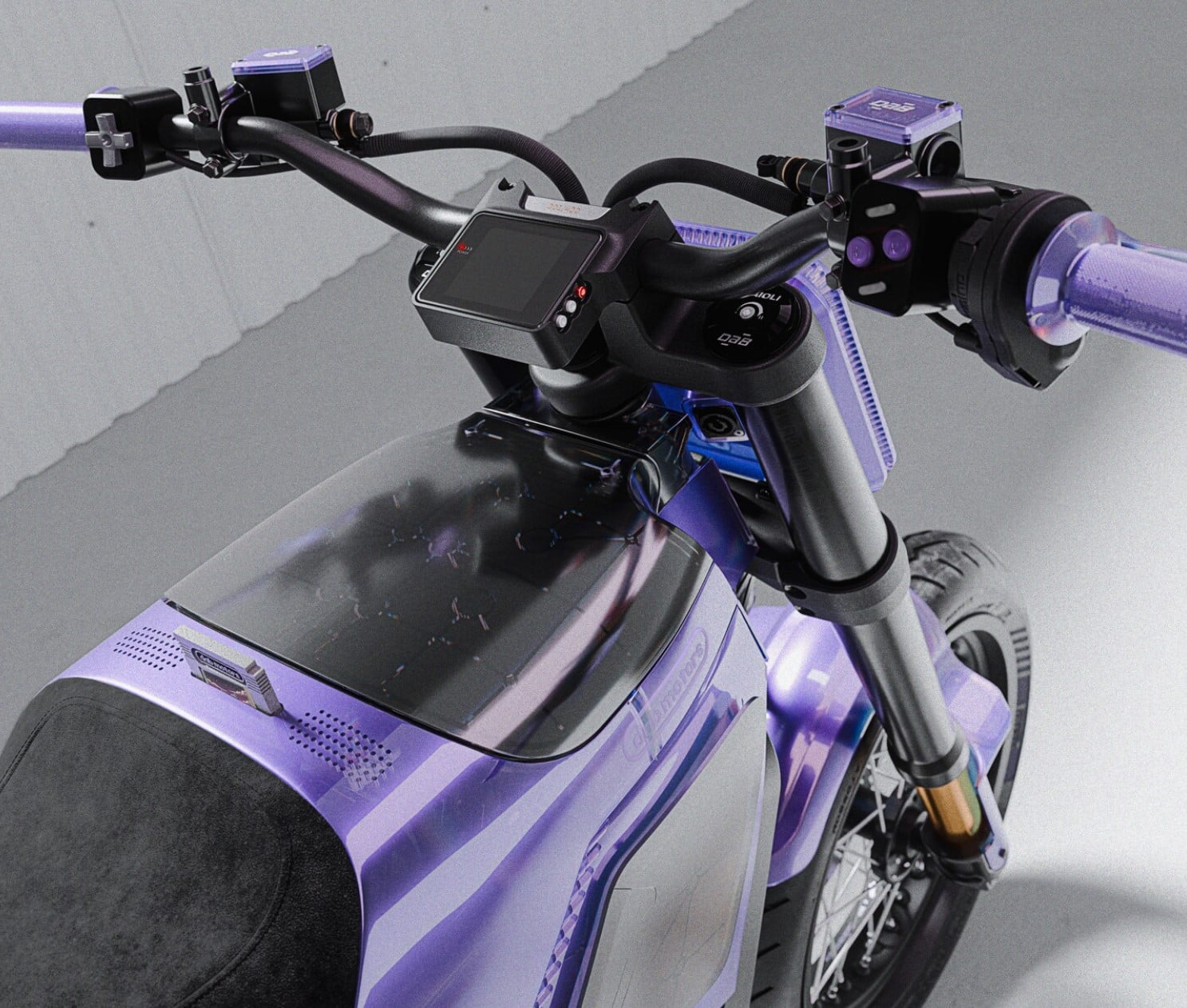 Pod przezroczystą obudową możemy dostrzec zarówno akumulator, który oferuje do 150 km zasięgu na jednym ładowaniu, jak i 25,5-kW silnik bezszczotkowy, pozwalający DAB 1α rozpędzić się do aż 130 km/h. Nie jest to więc byle zabawka, choć takie może sprawiać wrażenie, bo jego kluczyk przyjmuje postać kartridża (spokojnie, obędzie się bez przedmuchiwania), na kierownicy znalazło się kilka elementów rodem z kontrolera, a kilka kombinacji uaktywnia specjalne warianty wizualne wyświetlacza oraz aktywuje efekty dźwiękowe, przypominające stare czasy przed telewizorami CRT.