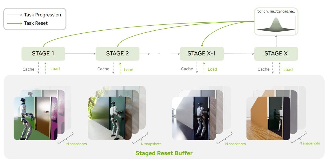 Robot opiera się wyłącznie na obrazie z konwencjonalnych kamer RGB, bez użycia czujników głębi czy systemów motion-capture. Musiał więc nauczyć się interpretować świat w sposób podobny do ludzkiego wzroku. Aby tego dokonać, inżynierowie musieli rozwiązać dwa kluczowe problemy. Pierwszy dotyczył efektywnego trenowania długiej sekwencji działań. Zastosowali mechanizm staged-reset, który zapamiętywał momenty częściowego sukcesu (np. poprawne chwycenie klamki), pozwalając treningom rozpoczynać się od tego punktu zamiast od zera.