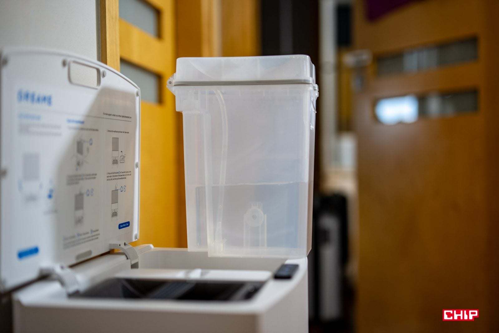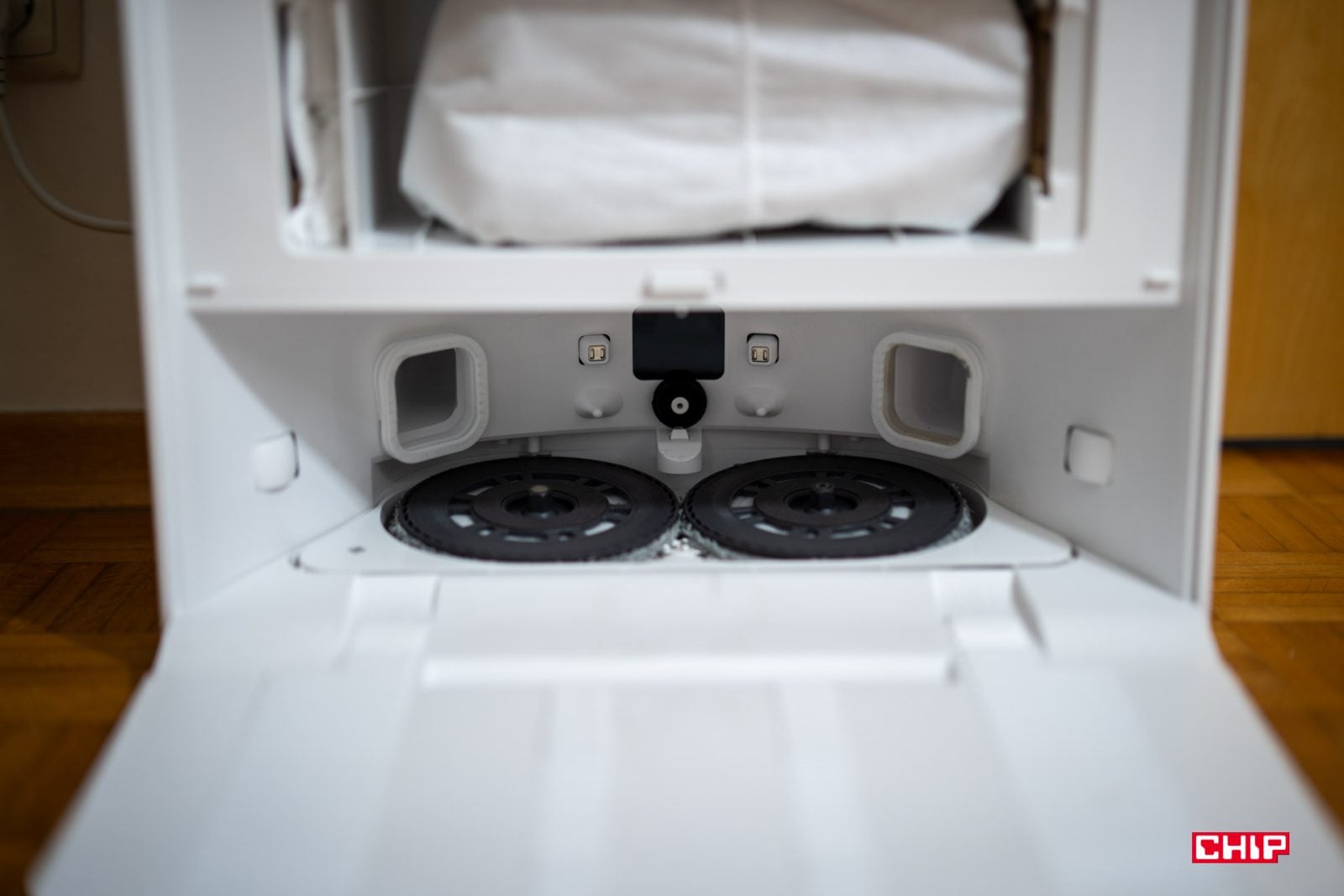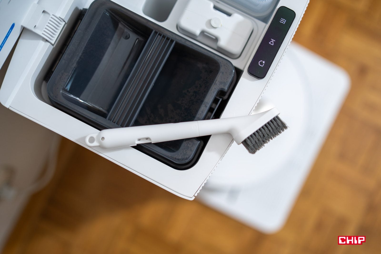 Dzięki powiększeniu obudowy we wnętrzu znalazły się większe pojemniki na wodę – czystą i brudną, większy pojemnik z detergentem i mam wrażenie, że jakby nico większy worek na kurz, obok którego znalazło się miejsce na przechowanie worka zapasowego. To właśnie wszystkie te elementy znajdują się w zamkniętej części konstrukcji.