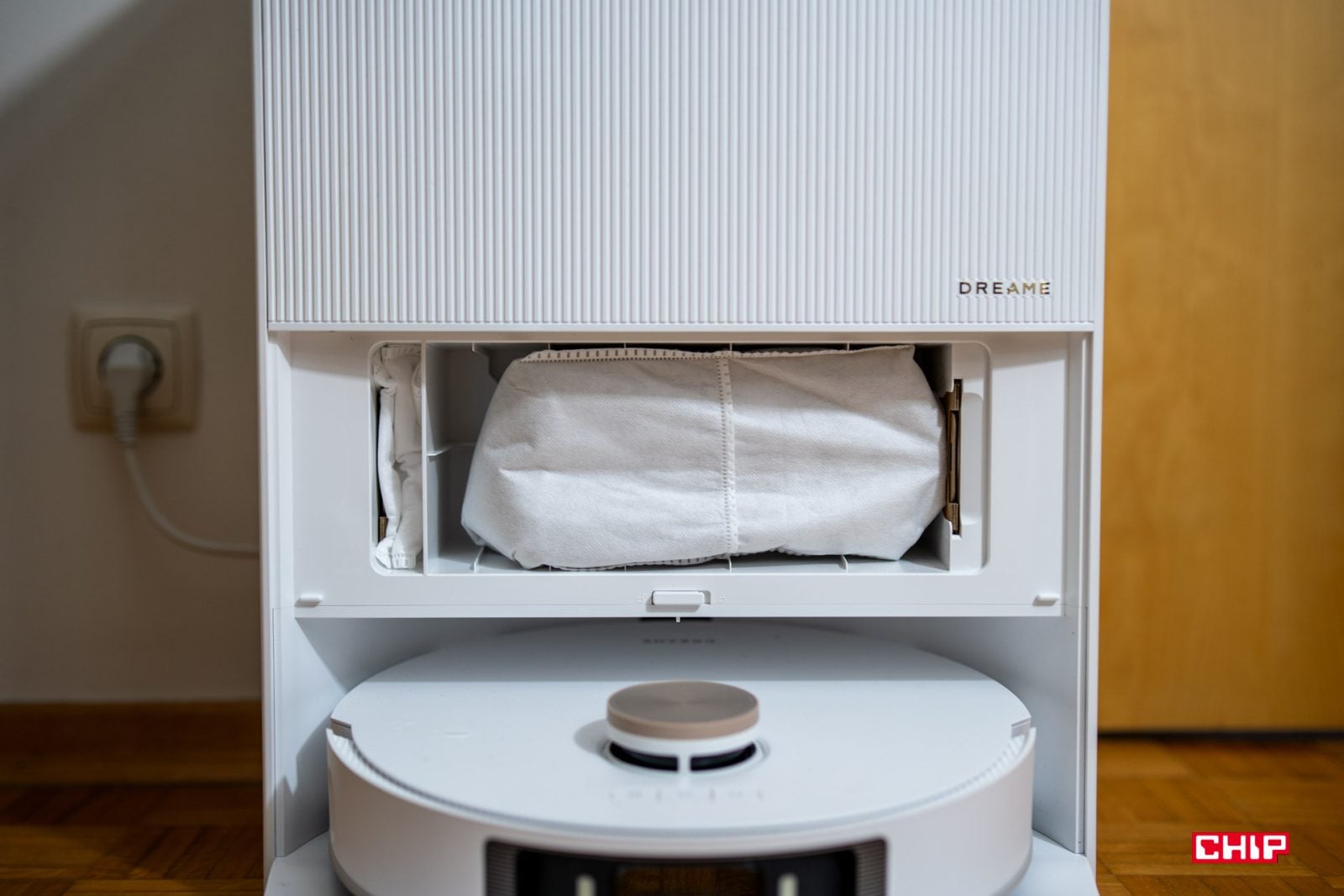 Dreame niestety nadal nie poradził sobie z problemem suszenia podkładek. To znaczy są suszone bardzo dobrze i dokładnie, do tego możemy wybrać, w jakim czasie mają się suszyć, ale miejsce suszenia lubi się brudzić i warto raz na jakiś czas wyjąć znajdującą się tam podkładkę i ją umyć, podobnie jak zawór, za pomocą którego robot wymienia wodę. Co warto dodać, robot sam informuje nas co jakiś czas, że warto to miejsce wyczyścić.