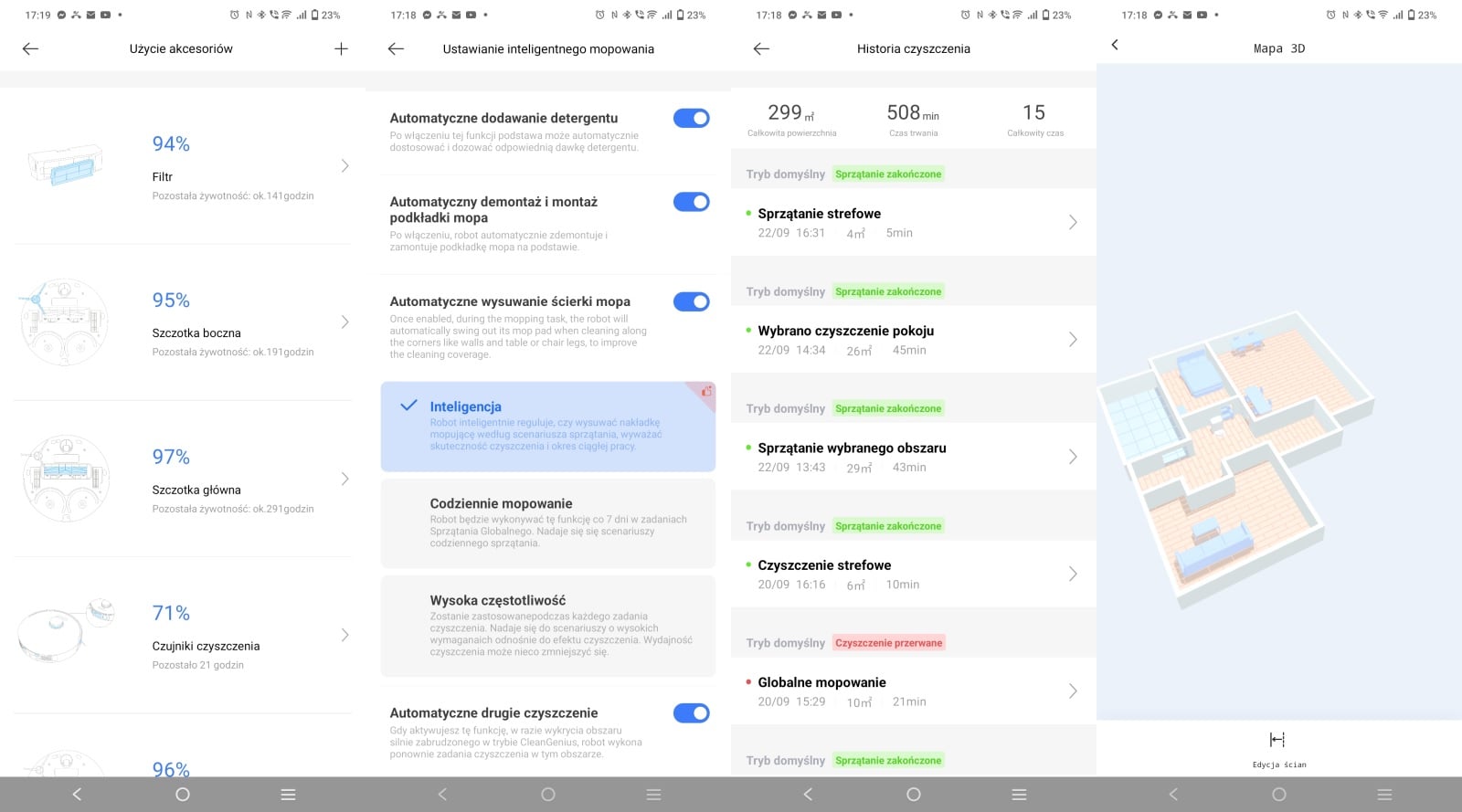 Czas pracy jest wzorowy. Jednorazowe odkurzenie i mopowanie podłóg w 60-metrowym mieszkaniu ani razu nie rozładowało mi akumulatora poniżej 60%.