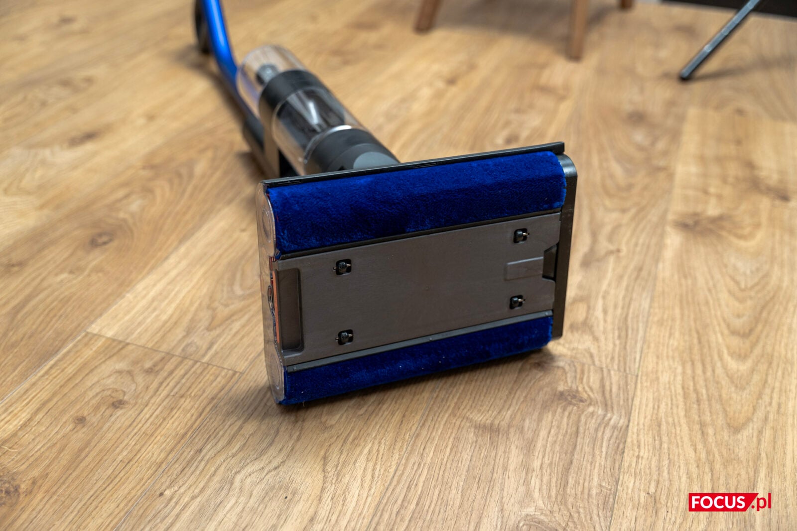 Idąc na przeciwległy koniec mopa trafimy na bardzo rozbudowaną bazę mopującą. Mamy tu dwie wysokoobrotowe szczotki z kosmicznie gęstej mikrofibry. Producent zapewnia, że mamy tu zagęszczenie na poziomie 64 800 włókien na cm2. Patrząc z boku trafimy na czerwony element, którym jest wysuwana tacka, ale o jej zadaniu porozmawiamy sobie nieco później.