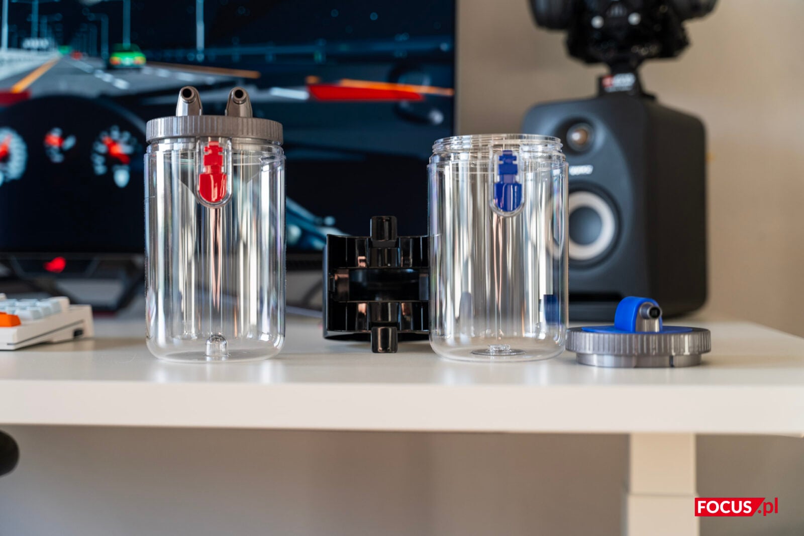 Teraz środek i tutaj mamy zbiorniki na wodę. Na górze na wodę czystą, na dole na brudną. Demontaż pojemników jest banalny, a żeby nalać wodę do jednego, a opróżnić drugi musimy je dodatkowo odkręcić – jak słoik. Dzięki temu mamy pewność, że wszystko jest idealnie szczelne.