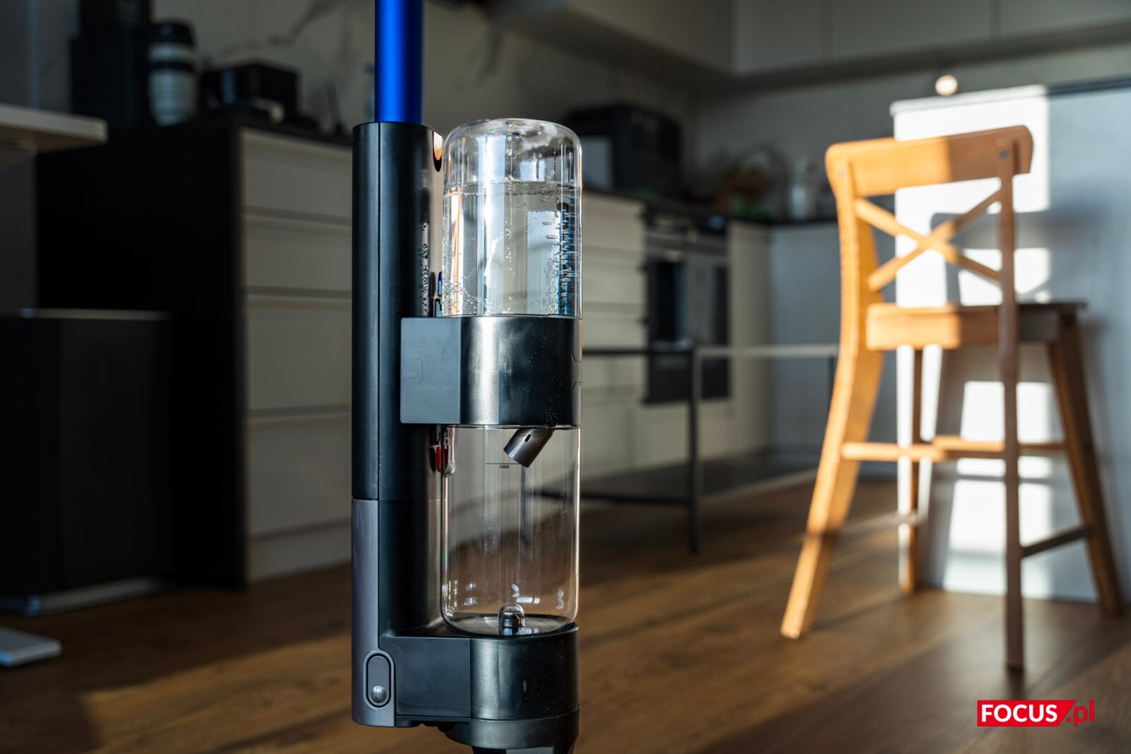Zbiornik na wodę brudną jest mniejszy i ma pojemność 0,8l. Z czego wynika różnica? Zapas wody służy do płukania szczotek. Po skończeniu sprzątania Dyson WashG1 przechodzi w tryb samoczyszczenia i faktycznie dzięki temu są w zasadzie zawsze gotowe do pracy. Dodajmy tutaj, że otwory w zbiornikach są bardzo duże, więc dolewanie wody czy płukanie zbiornika brudnej wody jest bardzo łatwe.