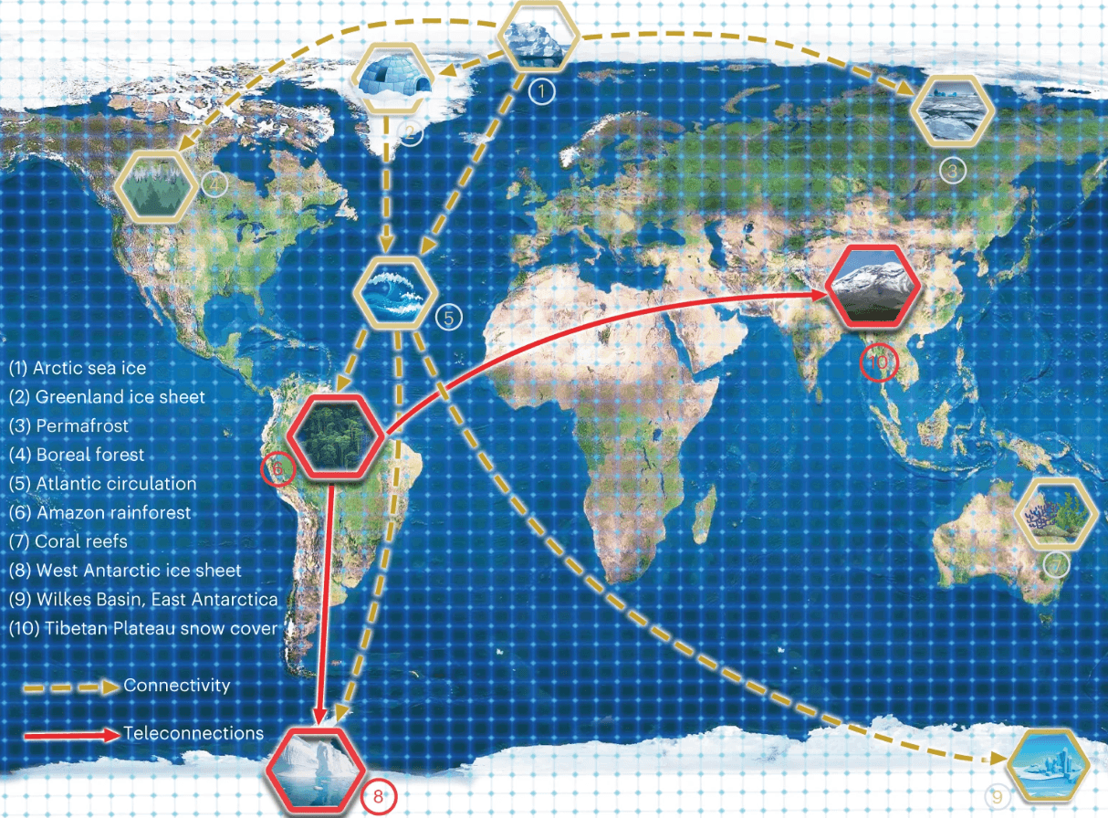 Okazuje się, że wycinka drzew w Ameryce Południowej powoduje wzrost temperatur w Amazonii, a te korelują się z rosnącymi temperaturami na Wyżynie Tybetańskiej i nad lądolodem Antarktydy Zachodniej. Ponadto wyższy poziom opadów atmosferycznych na terenie Amazonii skutkuje suszą w pozostałych dwóch regionach.