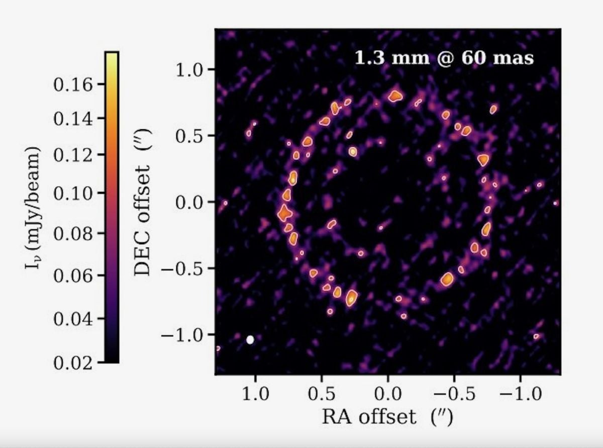 Dzięki wysokiej rozdzielczości radioteleskopu ALMA udało się dostrzec – ku zaskoczeniu astronomów – że czerwony karzeł w rzeczywistości otoczony jest nie tyle jednorodnym dyskiem pyłowo-gazowym, ile dwoma stosunkowo wąskimi pierścieniami pyłowymi o całkiem dużej średnicy. Wewnętrzna krawędź mniejszego pierścienia zaczyna się dopiero 10,5 miliarda kilometrów od gwiazdy. Sam pierścień jest niezwykle cienki, bowiem jego grubość to zaledwie 840 000 km. Potem mamy dużą przerwę i dopiero w odległości 16 miliardów kilometrów od gwiazdy znajdziemy wewnętrzną krawędź większego pierścienia. Ten pierścień również należy do cienkich, aczkolwiek jest nieznacznie grubszy od pierwszego – 1,27 miliona kilometrów.