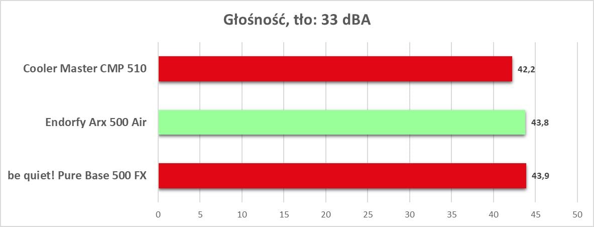 Obudowa nie należy do bardzo cichych, ale też przy pięciu 140 mm wentylatorach należało się tego spodziewać. Nie jest też bardzo głośno i śmigła są tylko trochę powyżej całego zestawu. Ważne żebyście zwrócili uwagę, że pod względem głośności Endorfy Arx 500 Air wypada podobnie jak obudowa be quiet!.