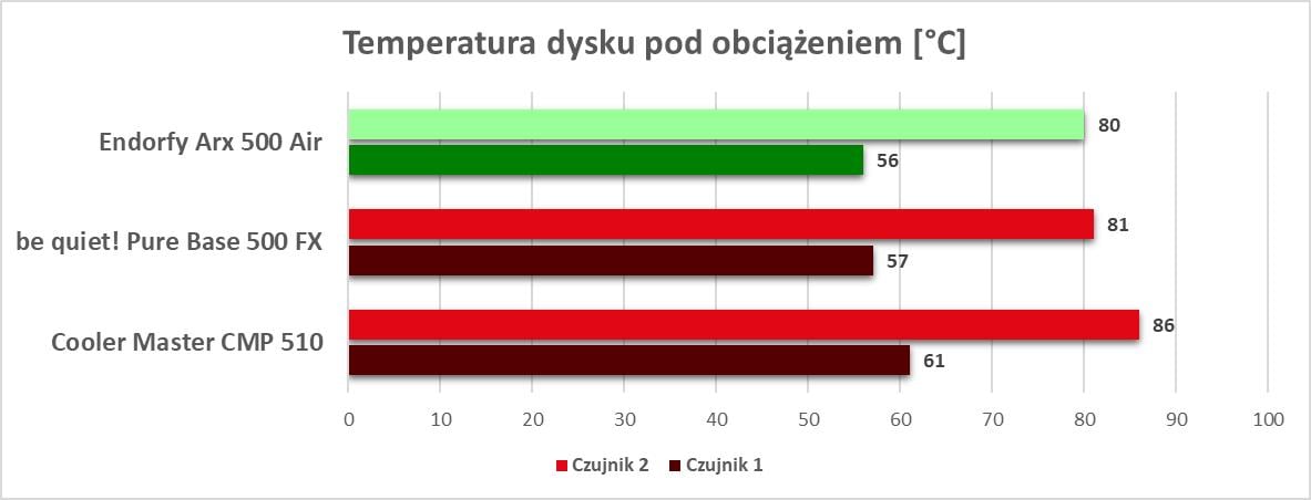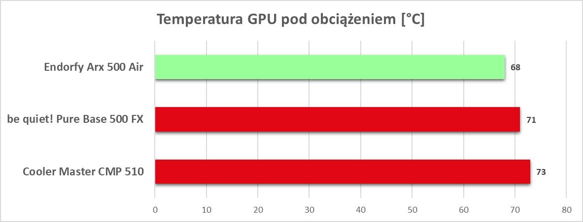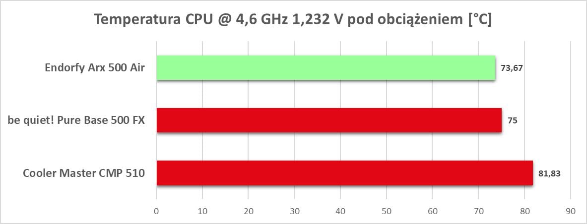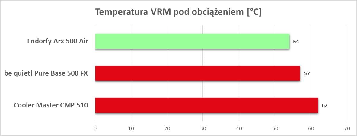 Pod względem temperatur jest bardzo dobrze. Skrzynka wyraźnie wyprzedza obudowę Pure Base 500 FX, co przy podobnym poziomie głośności jest naprawdę świetnym wynikiem. Mamy więc do czynienia z obudową, która oferuje naprawdę znakomity przepływ powietrza w szczególności biorąc pod uwagę cenę.