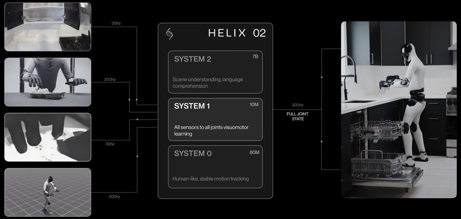 - System 1 (Kora ruchowa): Pracuje z częstotliwością 200 Hz. Łączy to, co widzą kamery w dłoniach i głowie, z ruchem kończyn. To on sprawia, że robot potrafi skorygować chwyt, gdy poczuje, że talerz się wysuwa.