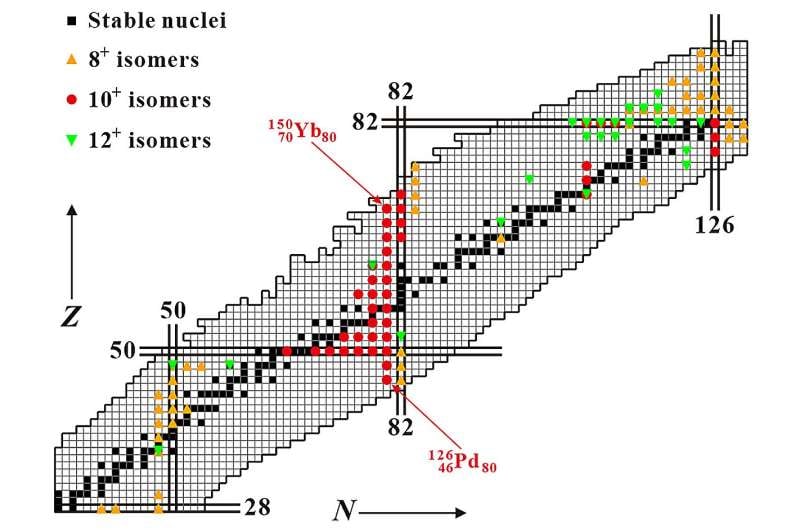 Na mapie jąder istnieje znany od dawna łańcuch kolejnych izomerów 10+ w parzysto-parzystych jądrach – od palladu-126 aż po erb-148. Był to najdłuższy taki ciąg znany fizyce jądrowej. Pytanie brzmiało, czy dalej, w bardziej ekstremalnym regionie, też da się znaleźć analogiczny stan, czy może konstrukcja jądra w końcu się “łamie” i dalszego ciągu już nie ma. Obserwacja w iterbie-150 pokazała, że łańcuch jednak sięga dalej.