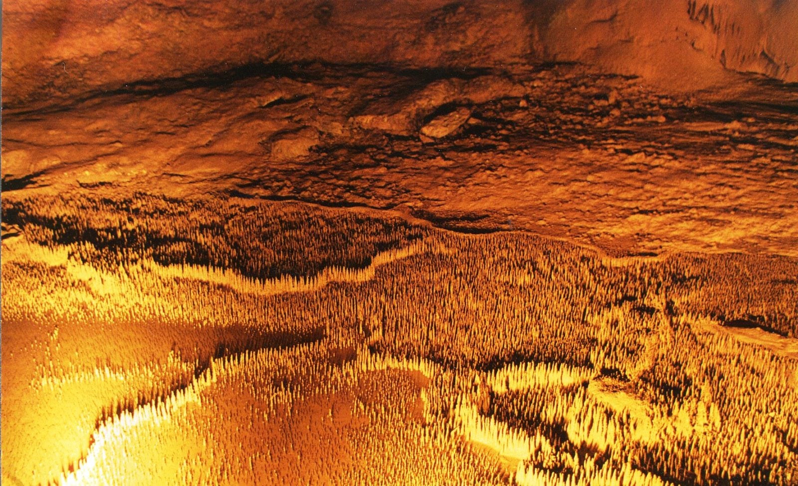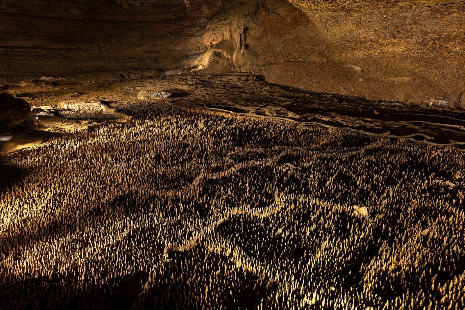Słupkowe formy na dnie jaskini powstały w niewyjaśniony sposób. Choć jest jedna teoria