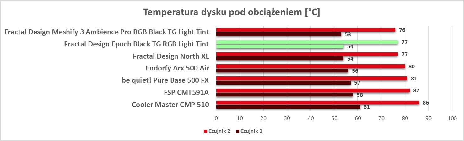 Wyniki testów są dobre. Obudowa przegrywa z Meshify 3, ale trzyma wysoki poziom. Bez wątpienia więc możecie liczyć na odpowiednie warunki do pracy nawet bardzo wydajnych podzespołów. Sama głośność może nie jest niska, ale patrząc na 2200 RPM na wentylatorach na pewno dobra. Spodziewałem się znacznie wyższego wyniku, a ten uzyskany pozytywnie zaskakuje.
