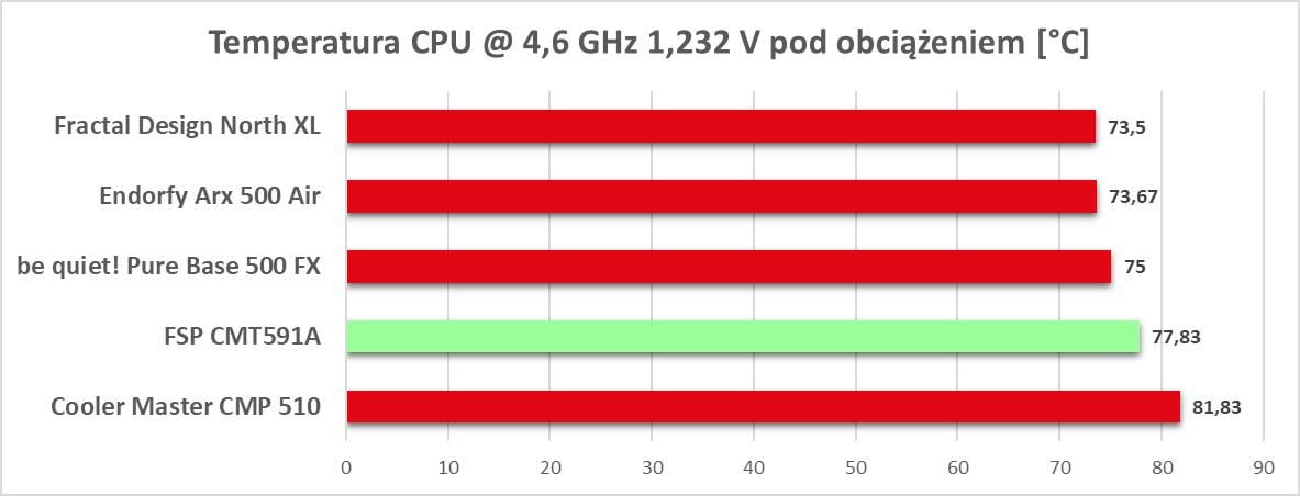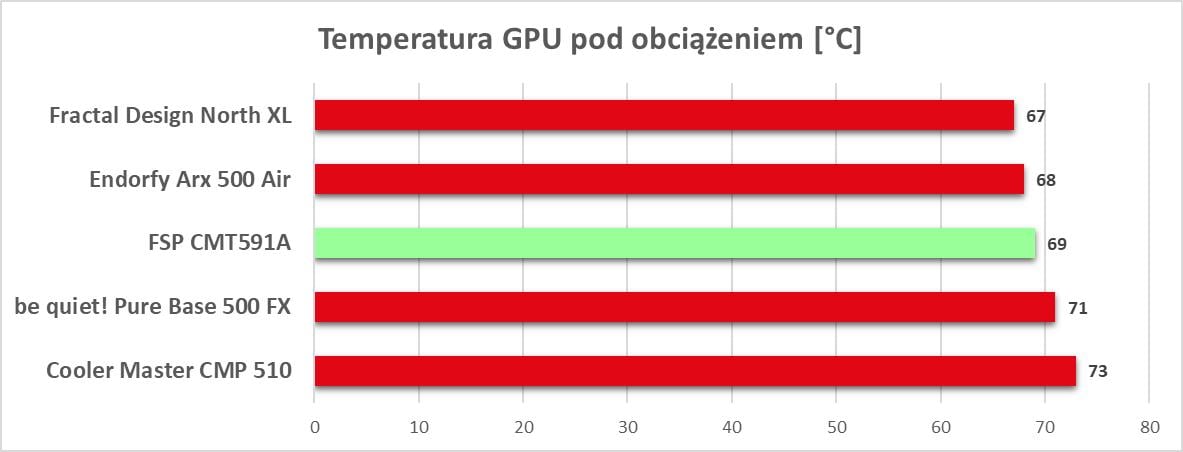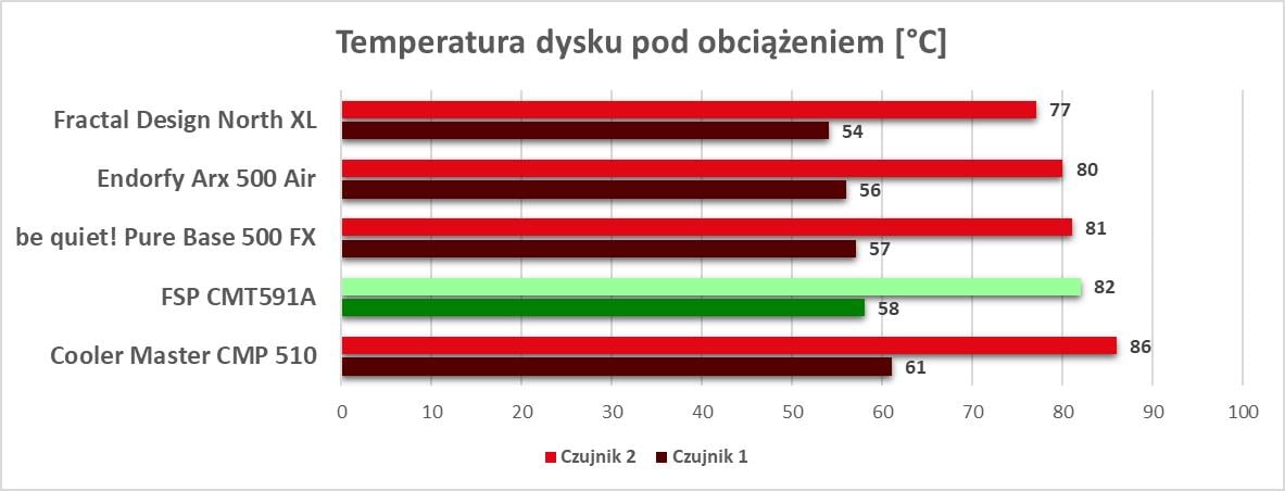Głośność nie jest zła. Może obudowa nie będzie niesłyszalna, ale też nie powinna być głośna. Szkoda tylko, że nie ma możliwości sterowania prędkością wentylatorów – w spoczynku może to trochę przeszkadzać. Temperatury są są najniższe, ale tez nie należą do wysokich. Obudowa przegrywa z konkurencjami mającymi czy więcej wentylatorów, czy szybsze. Natomiast bez problemów pokonuje CMP 510. Szkoda jednak, że nie ma trochę szybszych śmigieł z możliwością sterowania ich prędkością.