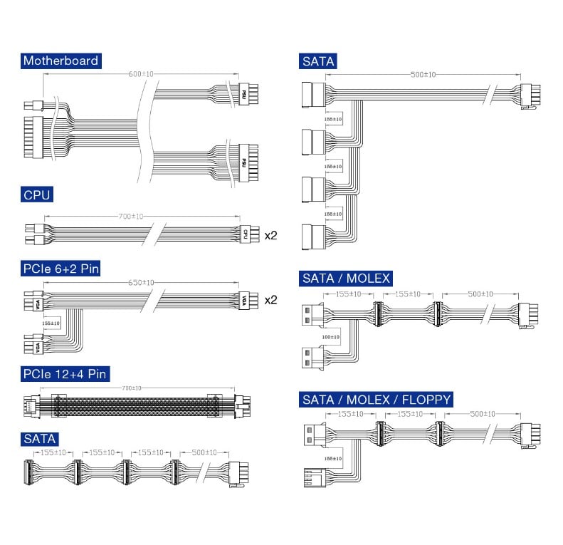 Okablowanie najlepiej pokazuje screen po prawej stronie. FSP Hydro PTM X PRO ATX3.0(PCIe5.0) 1000W mógłby mieć jeszcze jedną wiązkę PCIe. Plus za to dla mieszanych SATA + Molex. Długość jest odpowiednia i spokojnie wystarczy do dotarcia kablami do odpowiednich miejsc. Zasilacz oferuje złącze 12VHPWR 600 W oraz dwa EPS 4+4-pin. Prawie całe okablowanie ma płaski profil i jest elastyczne – nie będzie problemów z jego ładnym poprowadzeniem czy wpięciem we właściwe miejsca. Wyjątkiem jest 12VHPWR, który ma oplot oraz jego część od strony wtyczki jest prawie niemożliwa do wygięcia. Ma to na celu zapewnienie, że kabel nie zegnie się wcześniej niż powinien.