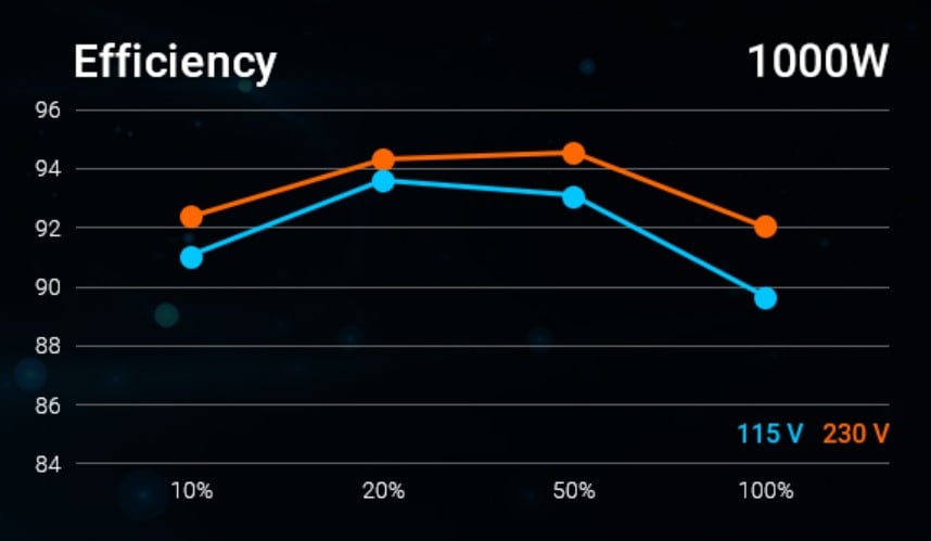 FSP Hydro PTM X PRO ATX3.0(PCIe5.0) 1000W ma odznaczenie 80 Plus Platinum, a jego sprawność dobrze przedstawia poniższa krzywa.