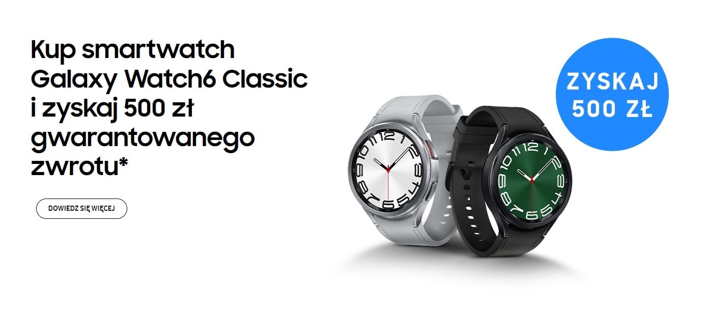 Z tych i jeszcze większej ilości funkcji będą mogli korzystać posiadacze Galaxy Watch 6 Classic. Dzięki najnowszej promocji smartwatch można zgarnąć taniej, a dokładnie – odzyskać zwrot części wydanych pieniędzy. Samsung oddaje aż 500 złotych, które można wydać na prezenty z okazji zbliżających się świąt. By otrzymać cashback, należy do 19 listopada zakupić urządzenie na stronie Samsunga lub u jednego z partnerów handlowych, takich jak Media Markt, Neonet, x-kom czy RTV Euro AGD. Następnie do 26 listopada konieczne jest wypełnienie formularza znajdującego się tutaj.