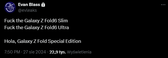Wydawało się, że kwestia nazwy cieńszej wersji Galaxy Z Fold 6 została już rozwiązana. Chociaż przez jakiś czas mówiono o nim jako o “Ultra”, dość szybko przerzucono się na “Slim”, co miało w sumie sporo sensu, biorąc pod uwagę fakt, że główną cechą tego modelu ma być jego smukłość. Evan Blass twierdzi jednak inaczej. Nie Galaxy Z Fold 6 Slim, ani Galaxy Z Fold 6 Ultra, tylko…. Galaxy Z Fold Special Edition.