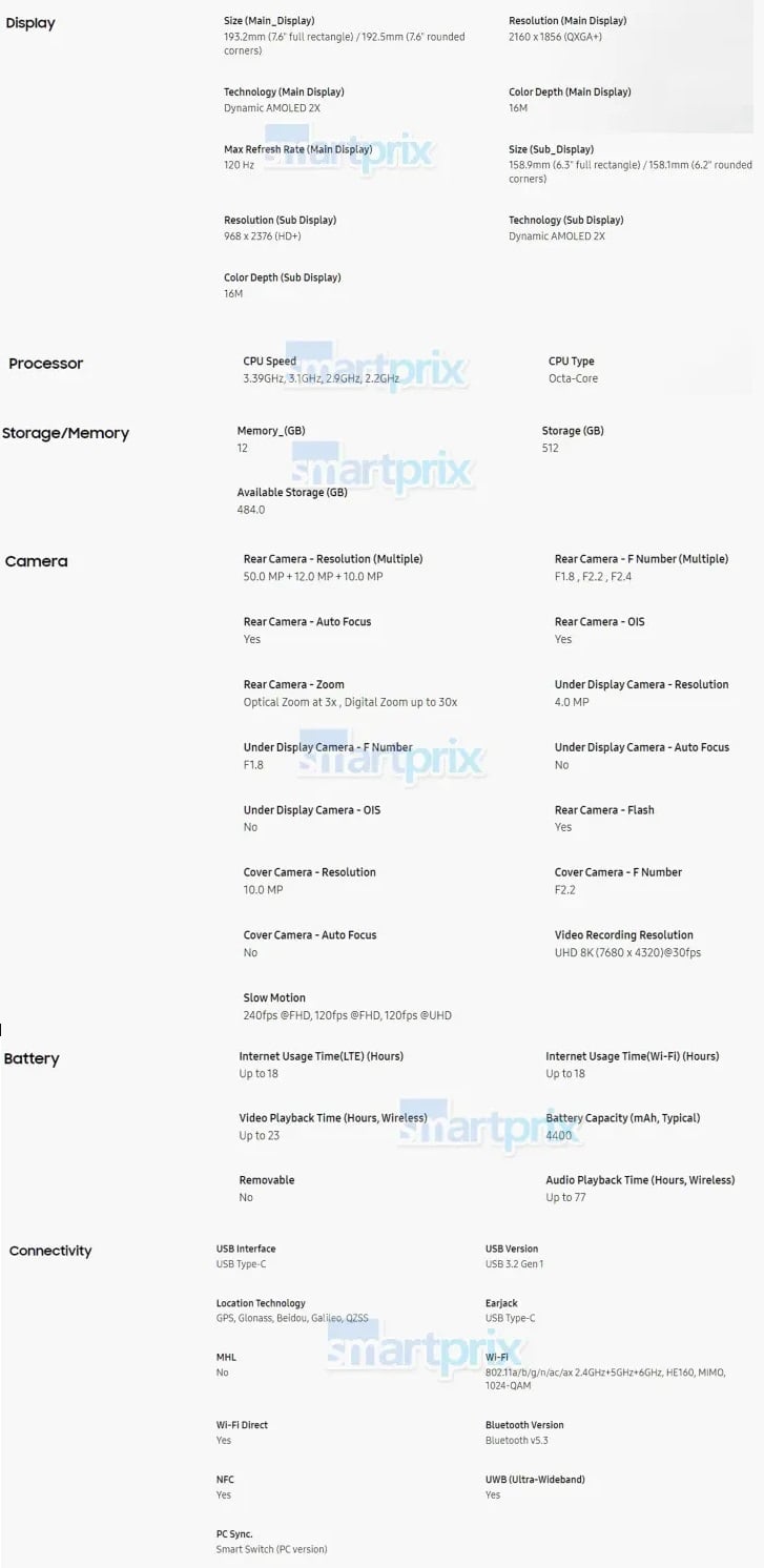 Różnicę widać w ekranach. Składany panel ma mieć przekątną 7,6″ i rozdzielczość 2160 x 1856 pikseli, natomiast zewnętrzny 6,3-calowy panel zaoferuje nam rozdzielczość 968 x 2376 pikseli. Zgodnie z przewidywaniami zewnętrzny ekran będzie więc nieco większy niż u poprzednika, a oba panele cechować się będą lepszą rozdzielczością. Oczywiście Samsung ulepszy również chipset, sięgając po Snapdragona 8 Gen 4, sparowanego z 12 GB pamięci RAM i 512 GB pamięci wbudowanej, a przynajmniej taka konfiguracja potwierdzona została na zrzutach ekranu. Spodziewać się można, że na rynku pojawią się też warianty z 256 GB i 1 TB pamięci na dane.