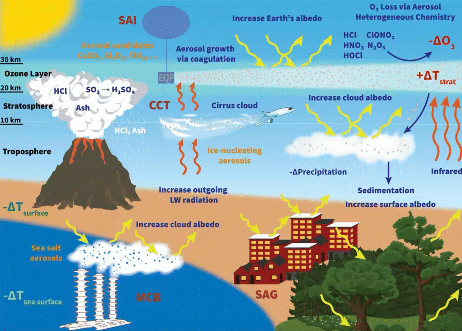 Równie istotne jest to, że naukowcy rozważają różne materiały do zastosowania w geoinżynierii. Obok tradycyjnych siarczanów badane są węglan wapnia, alfa-tlenek glinu, rutyl, anatazowy dwutlenek tytanu, tlenek cyrkonu i nawet diament. Każdy z tych kandydatów ma swoje teoretyczne zalety, ale także wprowadza nowe komplikacje. Rozpraszanie submikronowych aerozoli stałych okazuje się znacznie trudniejsze niż zakładano – materiały te mają tendencję do tworzenia dużych aglomeratów zamiast pozostawać pojedynczymi cząsteczkami, co drastycznie zmniejsza ich efektywność.
