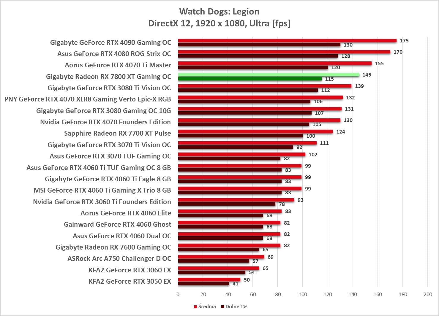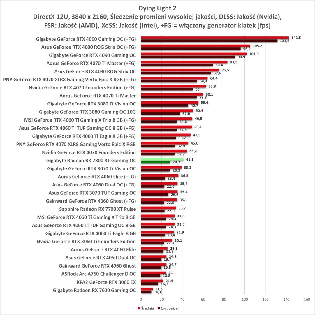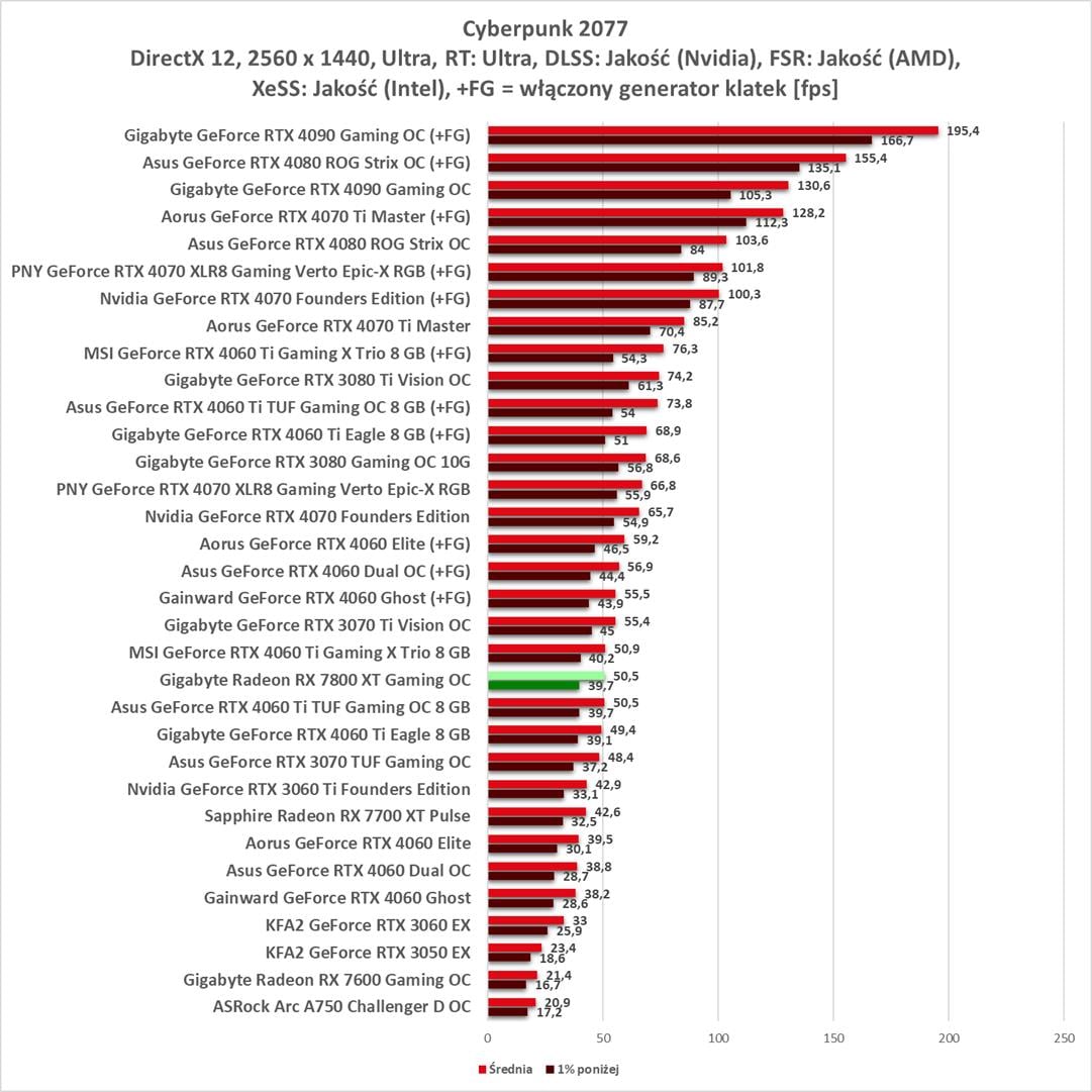 Pozostaje kwestia ceny. Ceny RX 7800 XT mają zaczynać się od 2699 zł, więc tutaj wersja OC będzie trochę droższa. Za 2900 zł kupicie już najtańsze modele RTX 4070. Mam nadzieję, że cena karty AMD trochę spadnie, bo wtedy jej wybór będzie znacznie bardziej opłacalny. Generalnie moim zdaniem wszystko zależy od ceny i Waszych wymagań. Jeśli nie możecie dołożyć do RTX 4070 to wiadomo, że 7800 XT będzie najlepszym wyborem w swojej cenie. Będzie to również bardzo dobry wybór jeśli gracie bez RT – tutaj karta pokonuje RTX 4070. Ale jeśli zależy Wam na śledzeniu promieni, niższym poborze mocy czy chcecie już korzystać z DLSS 3 a nie czekać na FSR 3 to warto rozważyć dopłatę do RTX 4070.