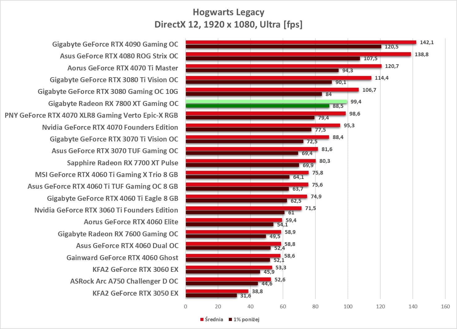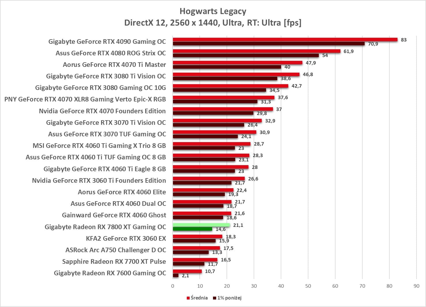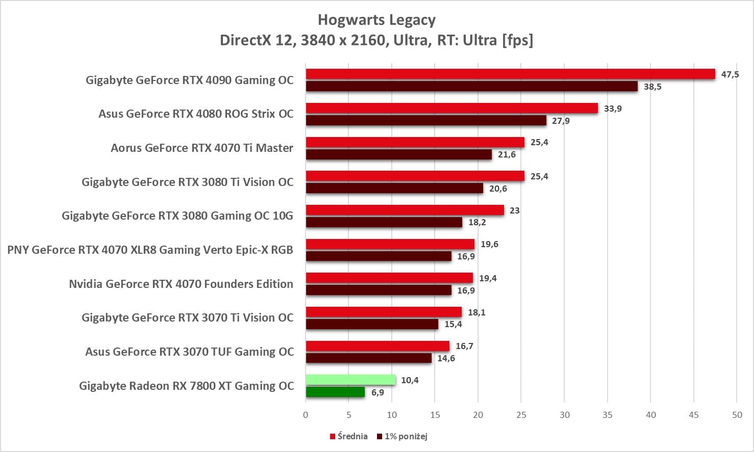 Wszystkie Radeony wypadają fatalnie w Hogwarts Legacy, więc nie inaczej jest w tym przypadku. Mamy jednak trzy gry z ponad 60 fps, a w Callisto Protocol karta wyprzedza nawet lekko RTX 4070. Natomiast w pozostałych grach mimo wszystko wyniki są słabsze.