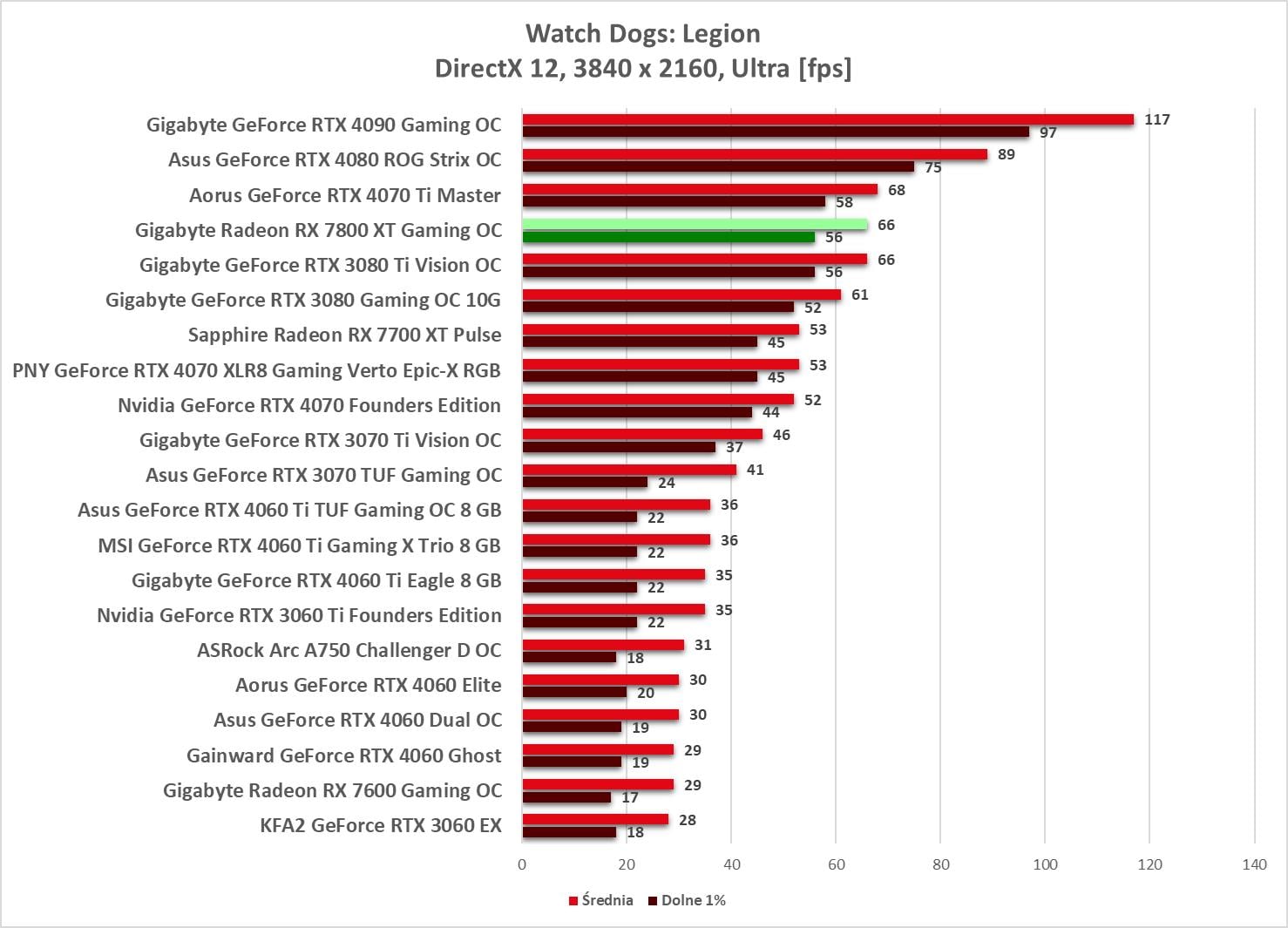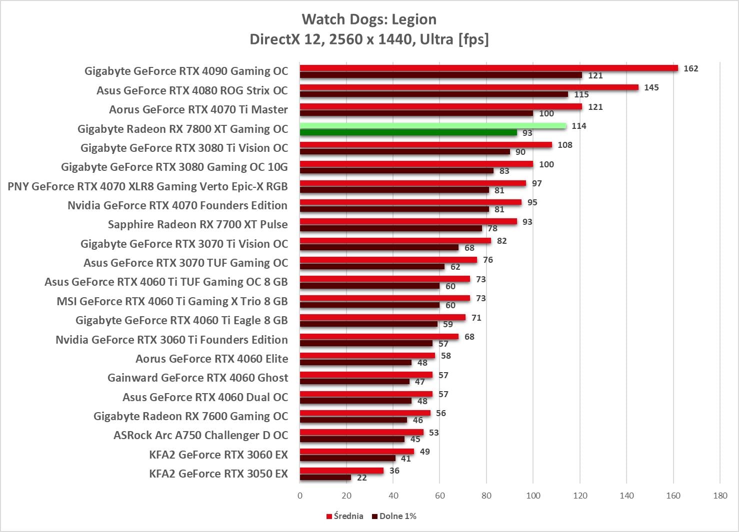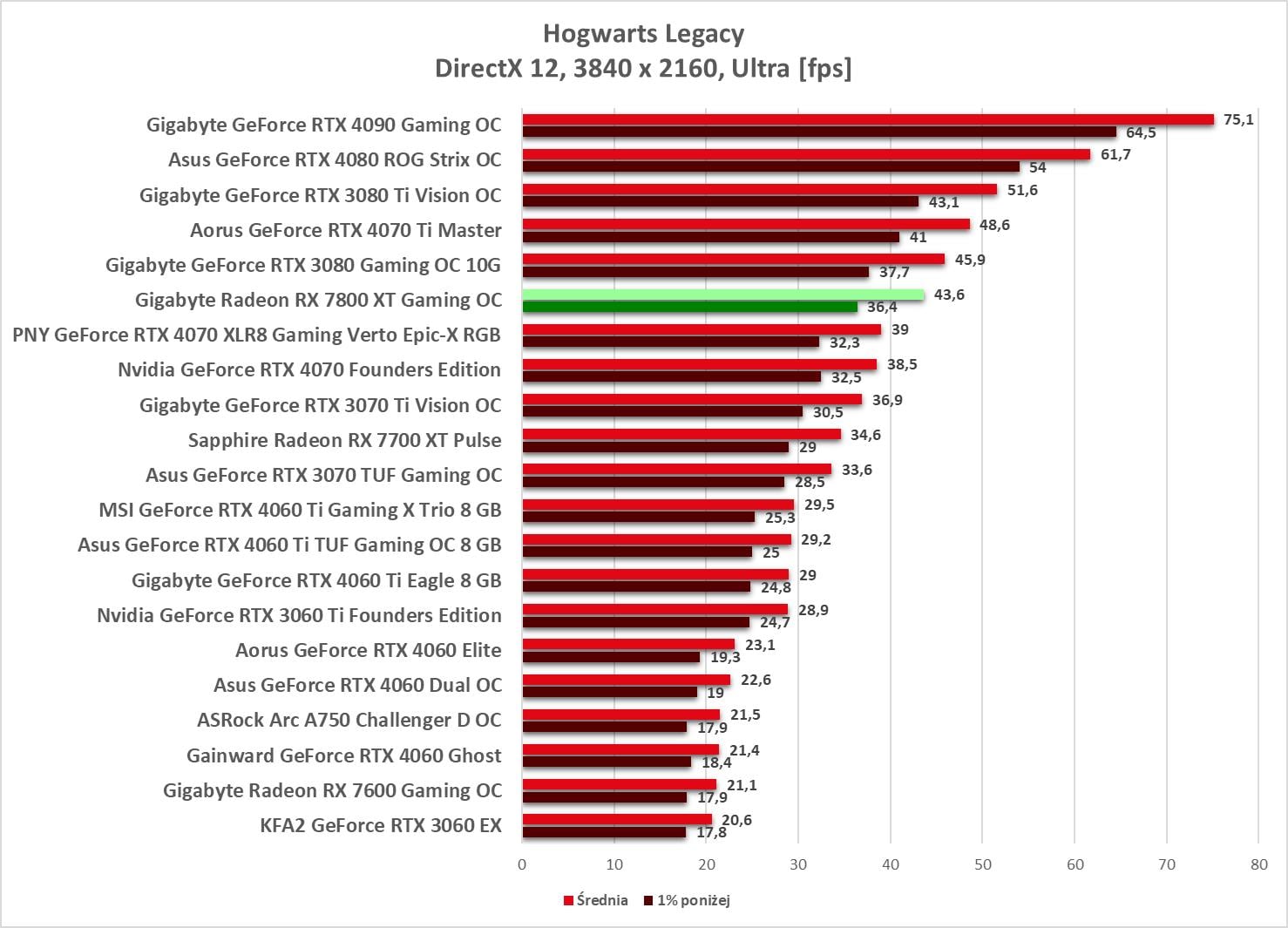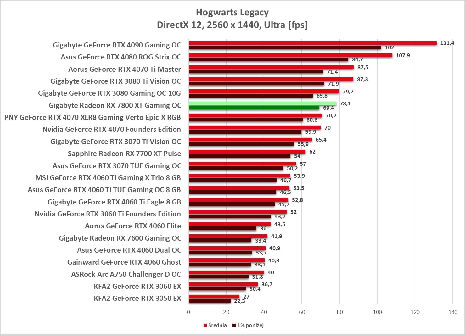 Wszystkie Radeony wypadają fatalnie w Hogwarts Legacy, więc nie inaczej jest w tym przypadku. Mamy jednak trzy gry z ponad 60 fps, a w Callisto Protocol karta wyprzedza nawet lekko RTX 4070. Natomiast w pozostałych grach mimo wszystko wyniki są słabsze.