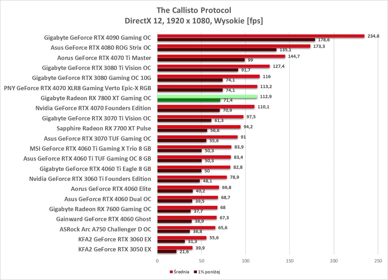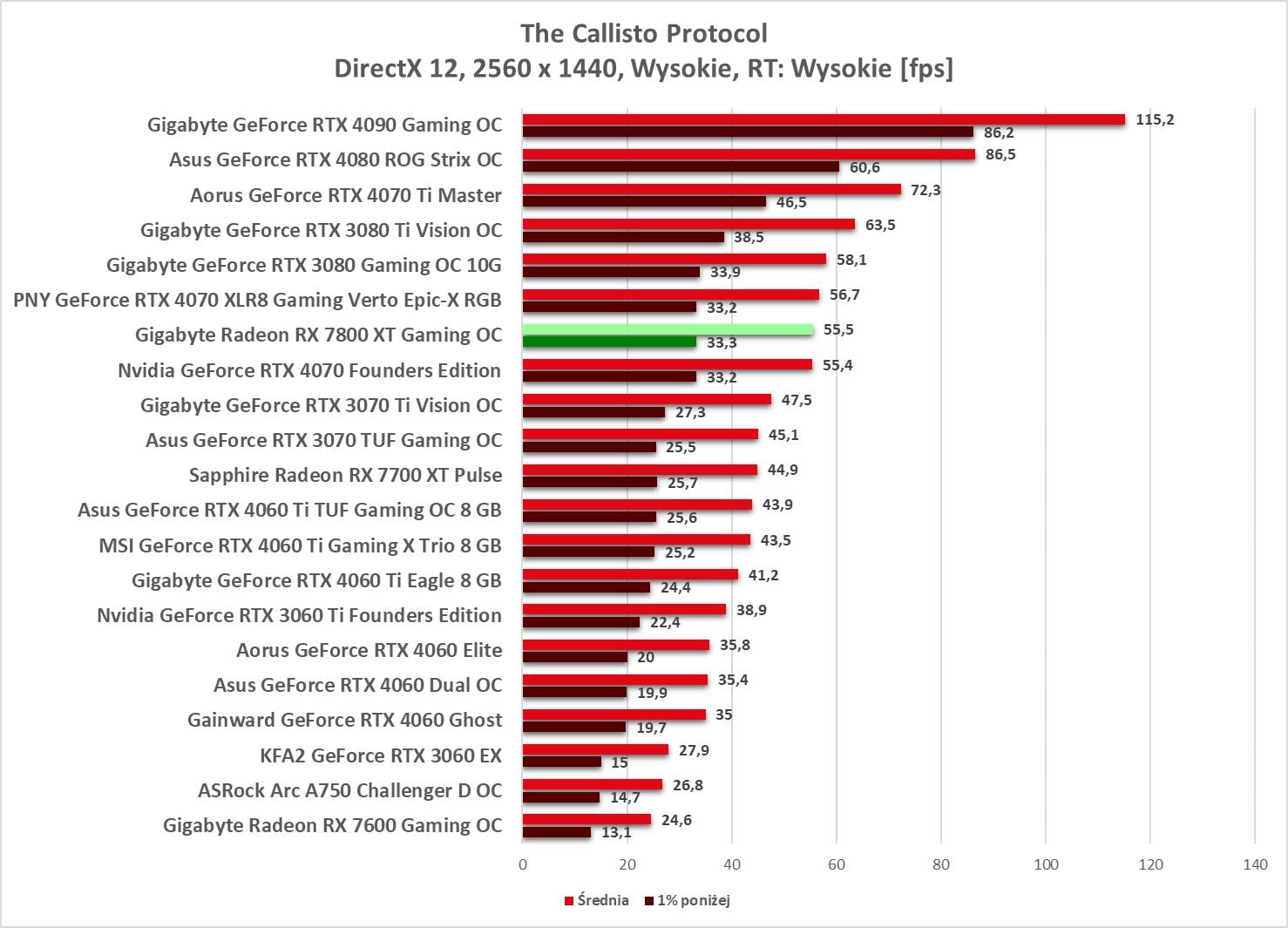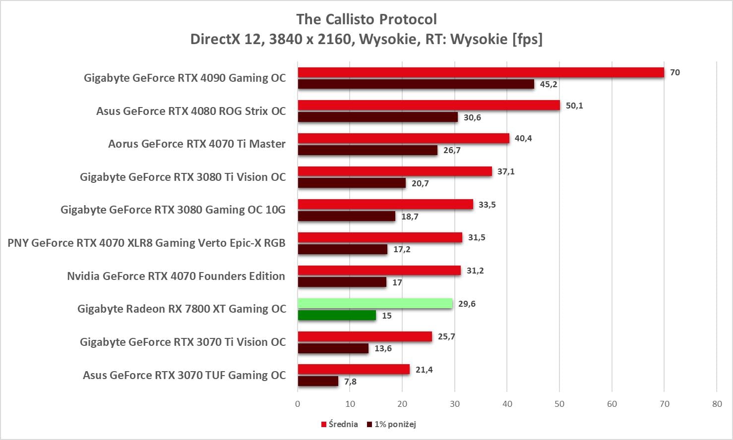 W przypadku gier z ray tracingiem jest już znacznie słabiej, a strata do RTX 4070 to ok. 19,4%, 18,4% oraz 19,5%. Karta traci więc sporo i zdarzają się takie wpadki jak w Hogwarts Legacy, gdzie zupełnie sobie nie radzi. Z drugiej strony jest jednak The Callisto Protocol z nawet ładnymi wynikami. Średnio jednak model Radeona jest słabszy od propozycji zielonych.