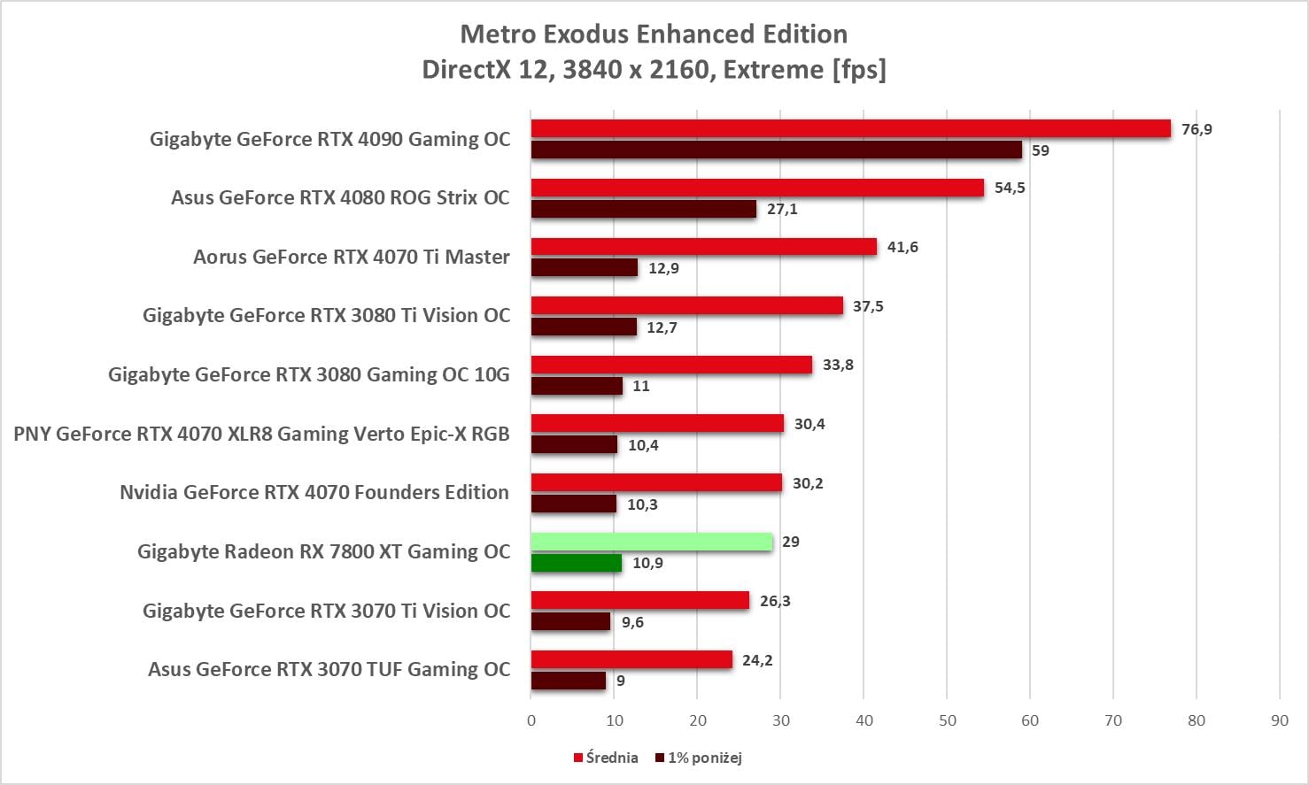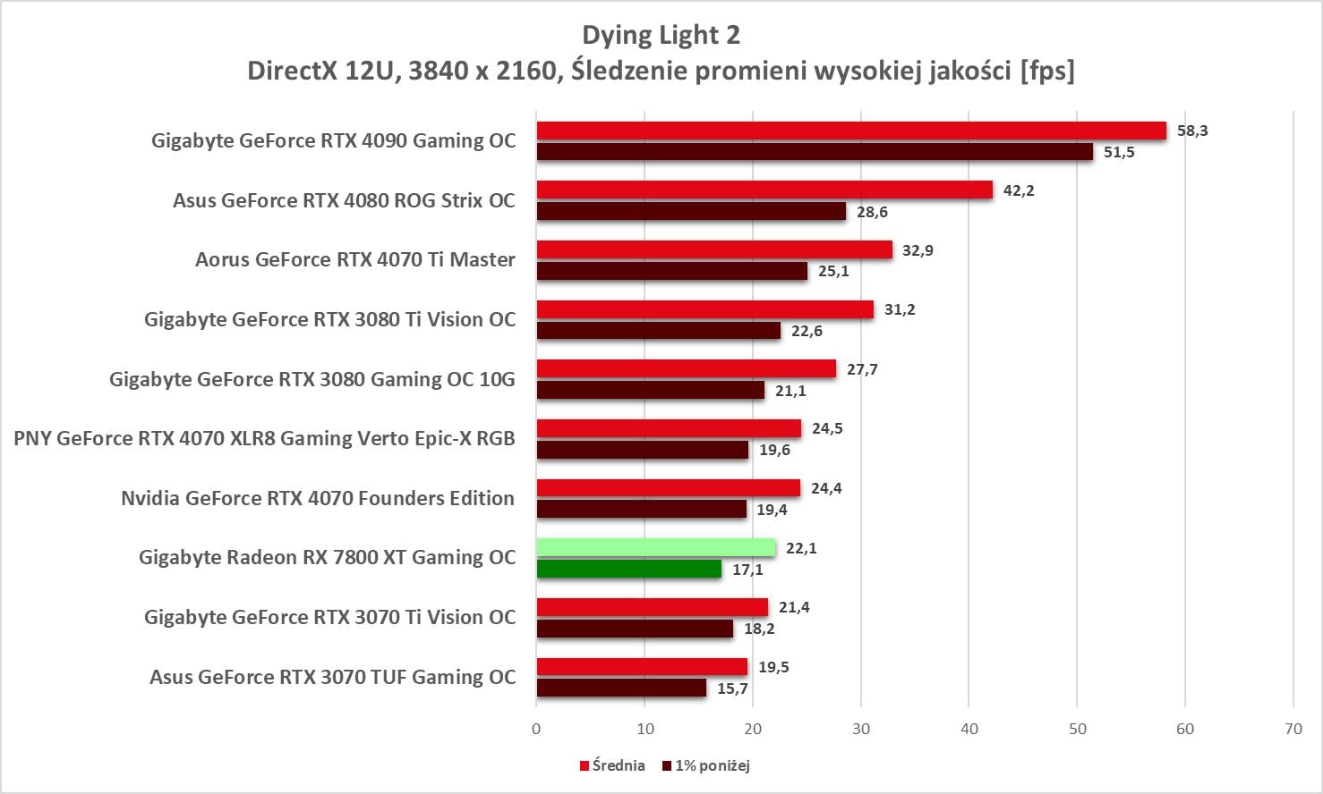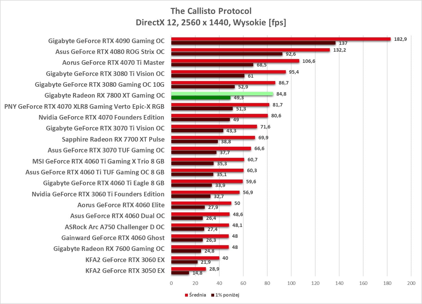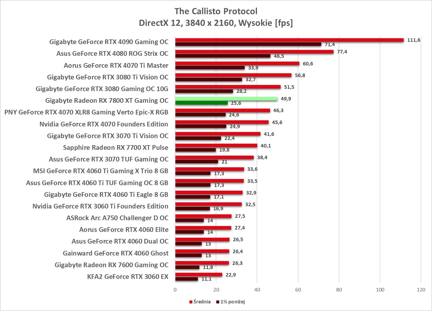 W przypadku gier z ray tracingiem jest już znacznie słabiej, a strata do RTX 4070 to ok. 19,4%, 18,4% oraz 19,5%. Karta traci więc sporo i zdarzają się takie wpadki jak w Hogwarts Legacy, gdzie zupełnie sobie nie radzi. Z drugiej strony jest jednak The Callisto Protocol z nawet ładnymi wynikami. Średnio jednak model Radeona jest słabszy od propozycji zielonych.