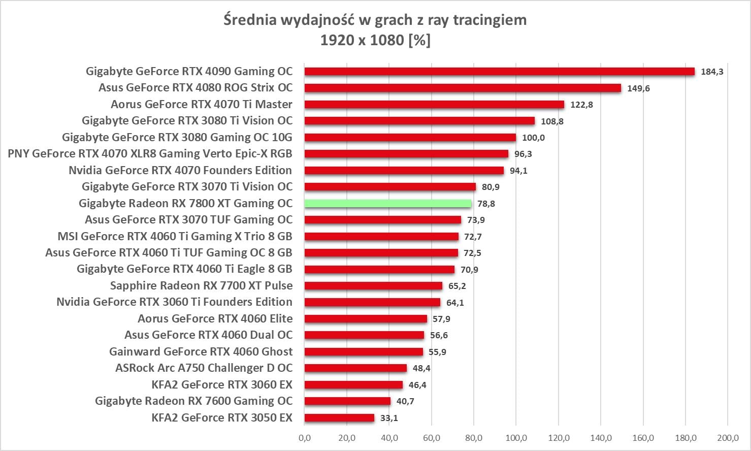 Szkoda, że nie mam na wykresach RX 6800 XT, bo ciekawe jaki przyrost względem poprzedniej generacji oferuje testowany model. Natomiast w stosunku do RTX 4070 Founders Edition mamy przewagę kolejno ok. 6,5%, 11,2% oraz 13,2%. Nie są to może duże różnice (w szczególności w pierwszej rozdzielczości), ale z pewnością karta po prostu wypada lepiej w rasteryzacji. Jej wyniki plasują ją w okolicach RTX 3080.