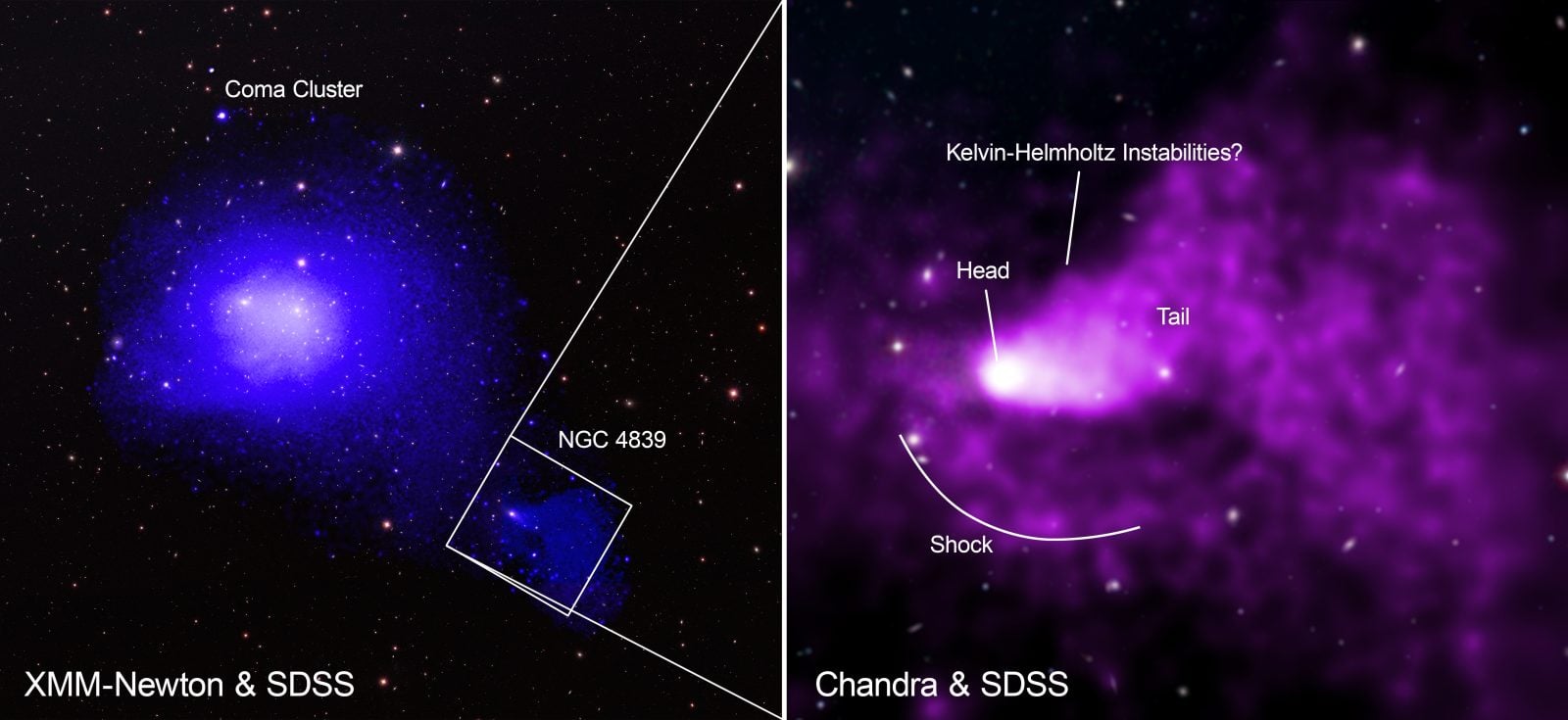 Na przedstawionym powyżej zdjęciu grupa galaktyk NGC 4839 znajduje się w dolnej prawej części kadru, a za nią widoczny jest rozległy obłok gazu. Kolorem niebieskim zaznaczono źródło promieniowania rentgenowskiego zarejestrowane przez teleskop XMM-Newton. Na zdjęciu po prawej natomiast przedstawiono obszar NGC 4839 zarejestrowany przez Kosmiczne Obserwatorium Chandra. Swoją drogą na tym drugim zdjęciu widoczny jest także punkt zderzenia gazu wypełniającego grupę galaktyk z otaczającym ją gazem wypełniającym Gromadę Coma. To właśnie w tym miejscu gromada uderza w otoczenie przemieszczając się w kierunku centrum gromady. Szacunki wskazują, że grupa przemieszcza się do centrum z prędkością pięciu milionów kilometrów na godzinę.