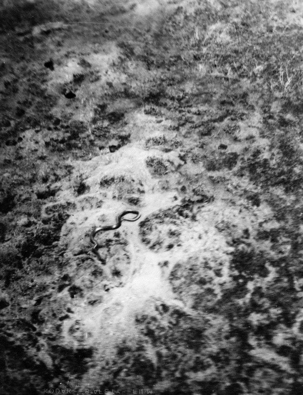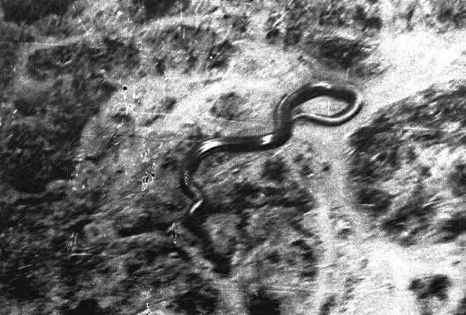 Pułkownik w 1959 r. wracał helikopterem z patrolu nad regionem Katanga w Demokratycznej Republice Konga, kiedy nagle zobaczył coś niezwykłego. Obniżył lot, a jego oczom ukazał się ok. 15-metrowej długości wąż, o ogromnej trójkątnej głowie, ciałem pokrytym ciemnobrązowymi i zielonymi łuskami, ale białym brzuchem. Pułkownik odbył jeszcze kilka przelotów nad wężem na niższej wysokości, aby umożliwić innej osobie na pokładzie zrobienie zdjęcie tej bestii.