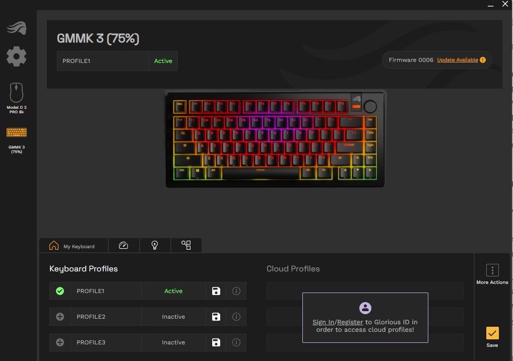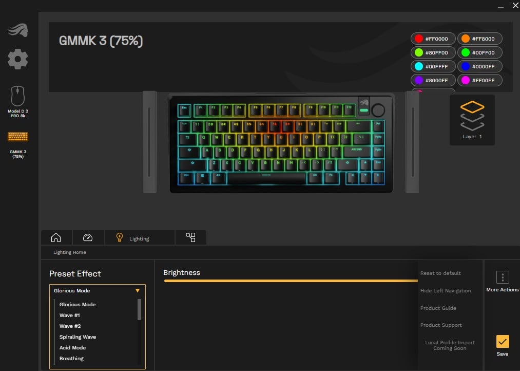 W aplikacji Core 2.1 zrobimy z kolei wszystko, czego możecie oczekiwać po ustawieniach związanych z klawiaturą mechaniczną. Mowa o dobieraniu efektów podświetlenia (zarówno całościowo, jak i wybiórczo dla konkretnego klawisza), nadpisywaniu ich funkcji (tyczy się to również makr) czy dostosowywaniu profilów, które można zresztą eksportować i importować nie tylko na dysk, ale też “do chmury” po zalogowaniu w usłudze producenta.