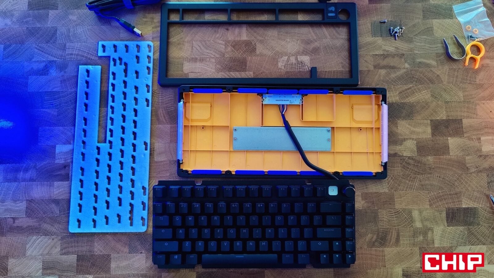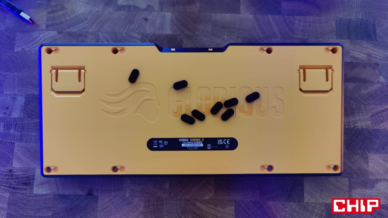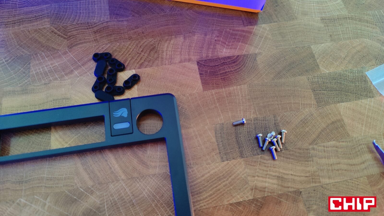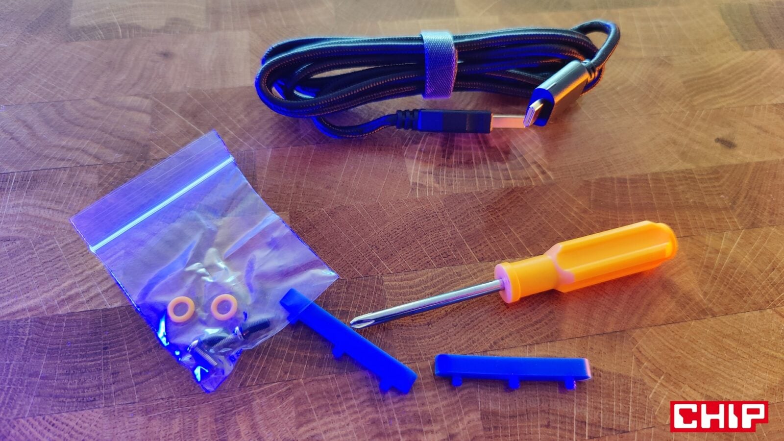 Poza tym w pudełku znajdziecie instrukcję obsługi, naklejki, broszurę o przełącznikach właśnie, dwa wymienne gumowe gaskety, dwa O-Ringi dla przełączników (możecie zweryfikować ich wpływ na charakter kliku), cztery zastępcze klawisze w przypadku korzystania z komputerów Mac, zapasowe śrubki, śrubokręt oraz przewód USB-A do USB-C w solidnym oplocie i z opaską na rzep do prostego cable-managementu na biurku. Innymi słowy, jest tego sporo, a sam śrubokręt przyda się wam nie tylko do odkręcenia zestawu ośmiu śrubek pod gumowymi zaślepkami na spodzie, które pełnią jednocześnie funkcję antypoślizgową. Mały skrawek gumy znalazł się też na rozkładanych plastikowych nóżkach, dorzucających dodatkowe stopnie nachylenia do i tak imponującego nachylenia podstawowego, które wymusza sama konstrukcja klawiatury.