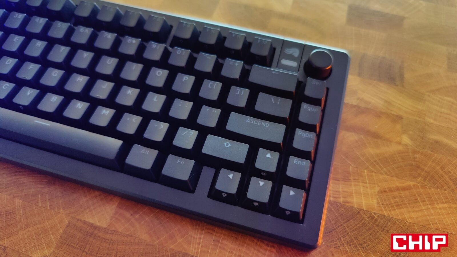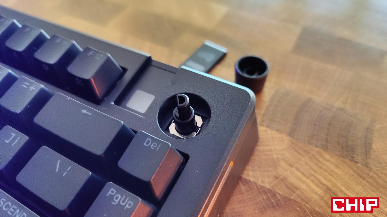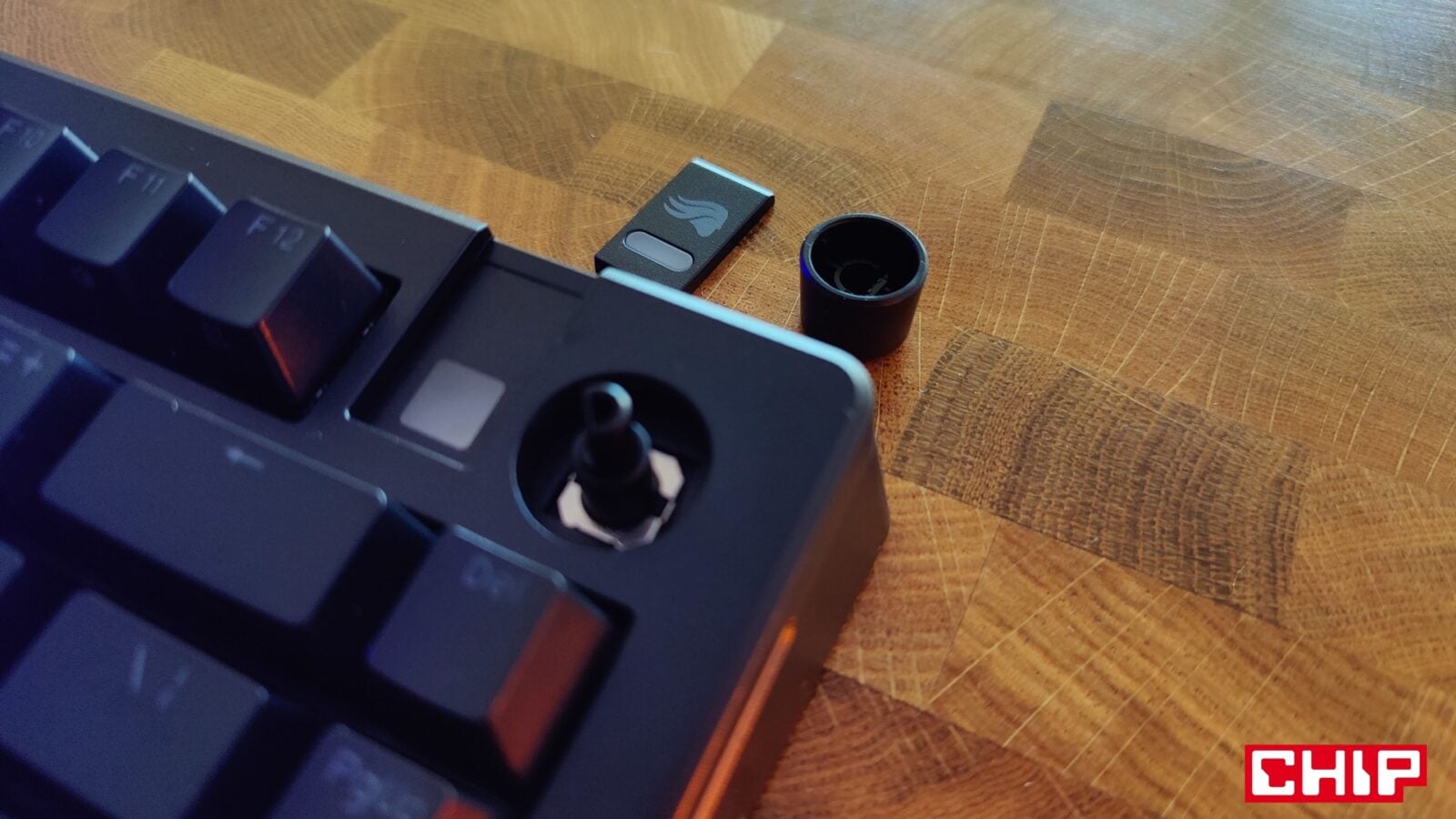 Jeśli idzie o inne elementy konstrukcyjne GMMK 3, to Glorious wprowadził do swojego modelu trzy unikalne dodatki. Mowa o najmniej użytecznej “odznace” na magnesach w prawym górnym rogu z logo producenta i mleczną wstawką, pod którą znajduje się jasna dioda, plastikowym pokrętle głośności o przyjemnym charakterze działania oraz “centrum dowodzenia” w formie dwóch przełączników i portu USB-C w centrum tylnej krawędzi. Jeden z przełączników odpowiada za wybranie aktualnego profilu, a drugi za wskazanie trybu pracy klawiatury zależnie od systemu operacyjnego (Windows/Mac).