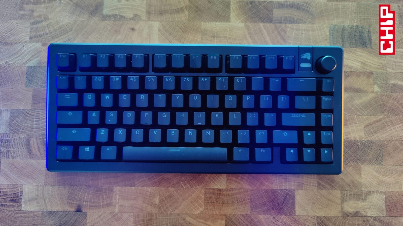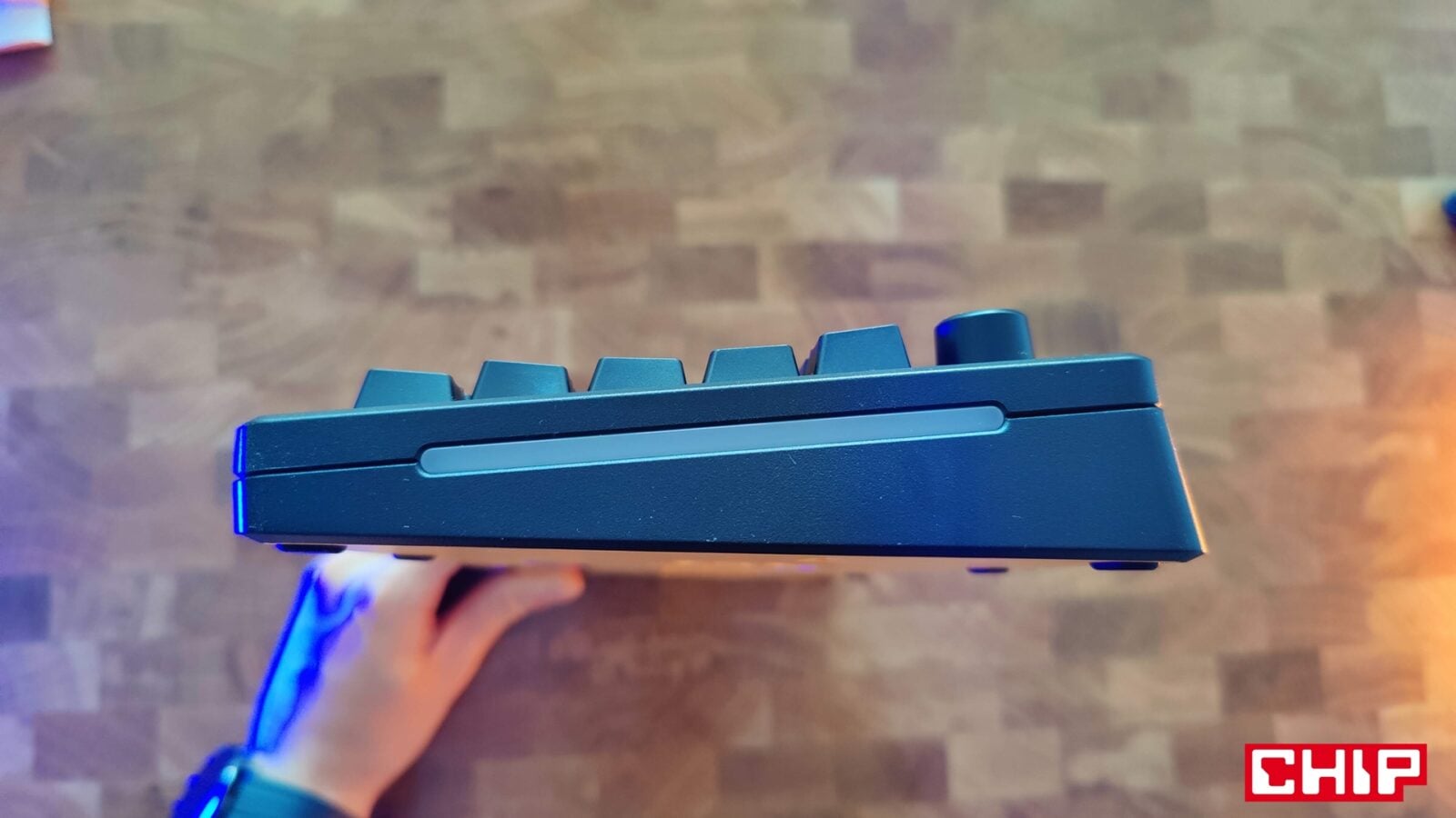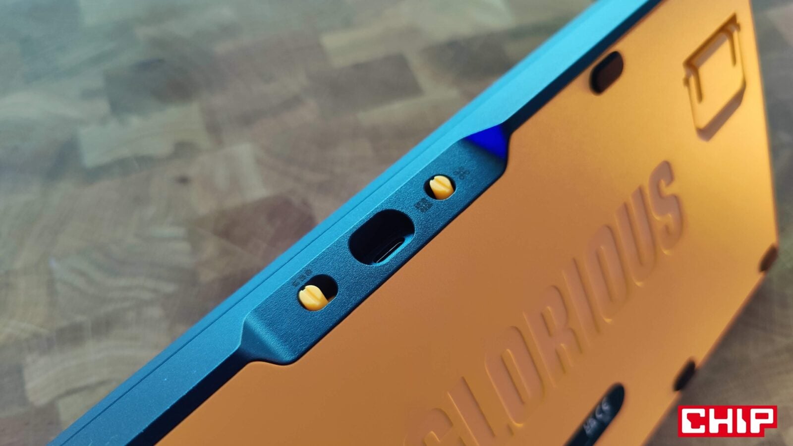 Jeśli idzie o inne elementy konstrukcyjne GMMK 3, to Glorious wprowadził do swojego modelu trzy unikalne dodatki. Mowa o najmniej użytecznej “odznace” na magnesach w prawym górnym rogu z logo producenta i mleczną wstawką, pod którą znajduje się jasna dioda, plastikowym pokrętle głośności o przyjemnym charakterze działania oraz “centrum dowodzenia” w formie dwóch przełączników i portu USB-C w centrum tylnej krawędzi. Jeden z przełączników odpowiada za wybranie aktualnego profilu, a drugi za wskazanie trybu pracy klawiatury zależnie od systemu operacyjnego (Windows/Mac).