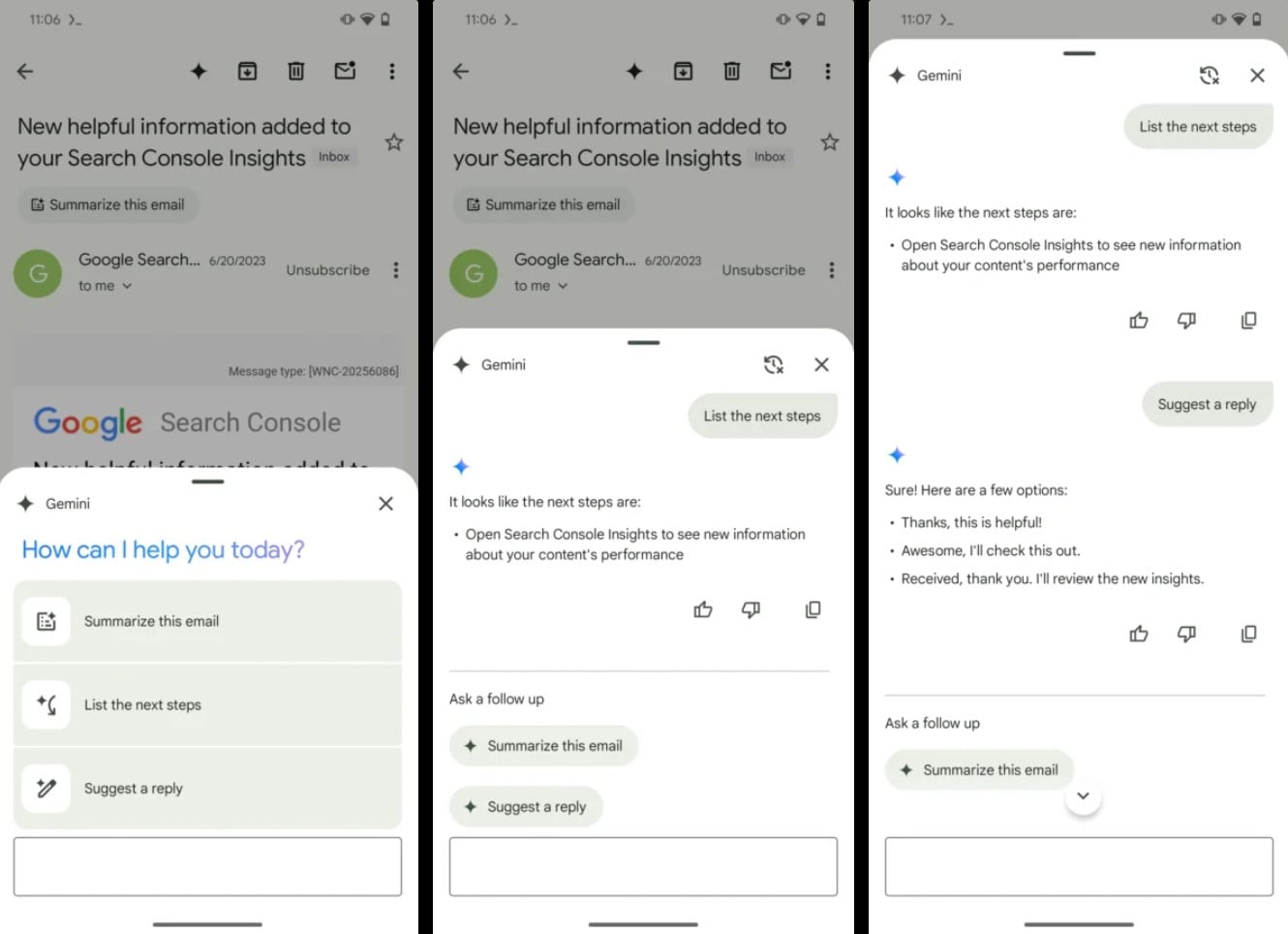 Jak widzicie powyżej, firma udoskonaliła interfejs użytkownika dla przycisku Gemini. Znajdziemy tam teraz nowe szybkie podpowiedzi, takie jak „Podsumuj tę wiadomość e-mail”, „Wypisz kolejne kroki” i „Zaproponuj odpowiedź”. Oprócz sugerowanych akcji, za pomocą przycisku możemy także wykonywać różnorodne zadania, takie jak redagowanie odpowiedzi na e-maile, zmiana tonu tworzonych odpowiedzi, a nawet obsługa niektórych zapytań niezwiązanych z pocztą elektroniczną.