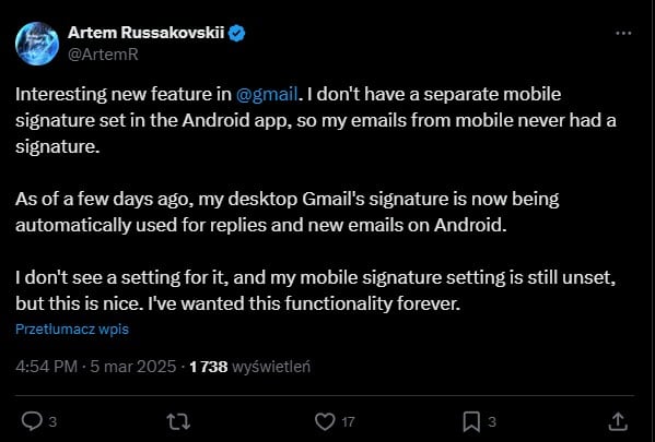 Jak wspomniałam, nie jest to może wielka zmiana, ale na pewno będzie przydatna. Zwłaszcza dla osób, które zwykle korzystają z Gmaila na komputerze, gdzie mają skonfigurowany podpis. Wcześniej odpowiadając na wiadomości na telefonie, jeśli nie dodali tam podpisu, był on nieobecny, a po wdrożeniu funkcji automatycznie pojawia się on również w mailach wysyłanych z urządzenia mobilnego.