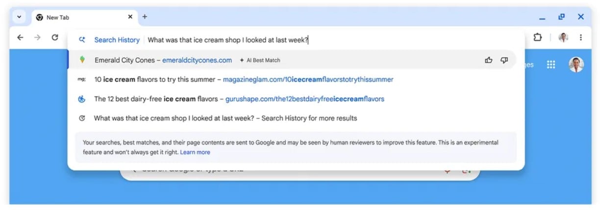 Ogłoszona na blogu funkcja wykorzysta konwersacyjną sztuczną inteligencję, aby znaleźć wcześniej odwiedzane strony. Dostaniemy możliwość zadawania pytań w języku naturalnym, takich jak „Jaki był ten przepis na naleśniki, z który ostatnio znalazłem?”. Chrome w odpowiedzi wyświetli nam odpowiednie strony z naszej historii, pasujące do tego zapytania. By z niej skorzystać, wystarczy wejść w historię i zacząć pisać, co widać na poniższym zrzucie ekranu.
